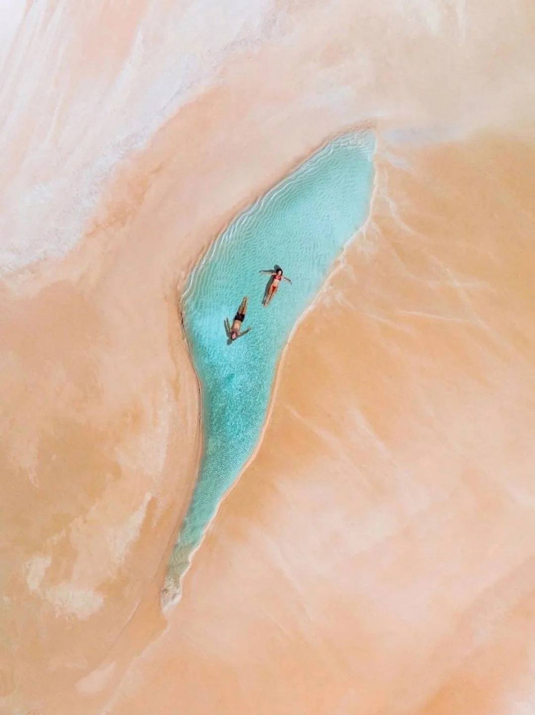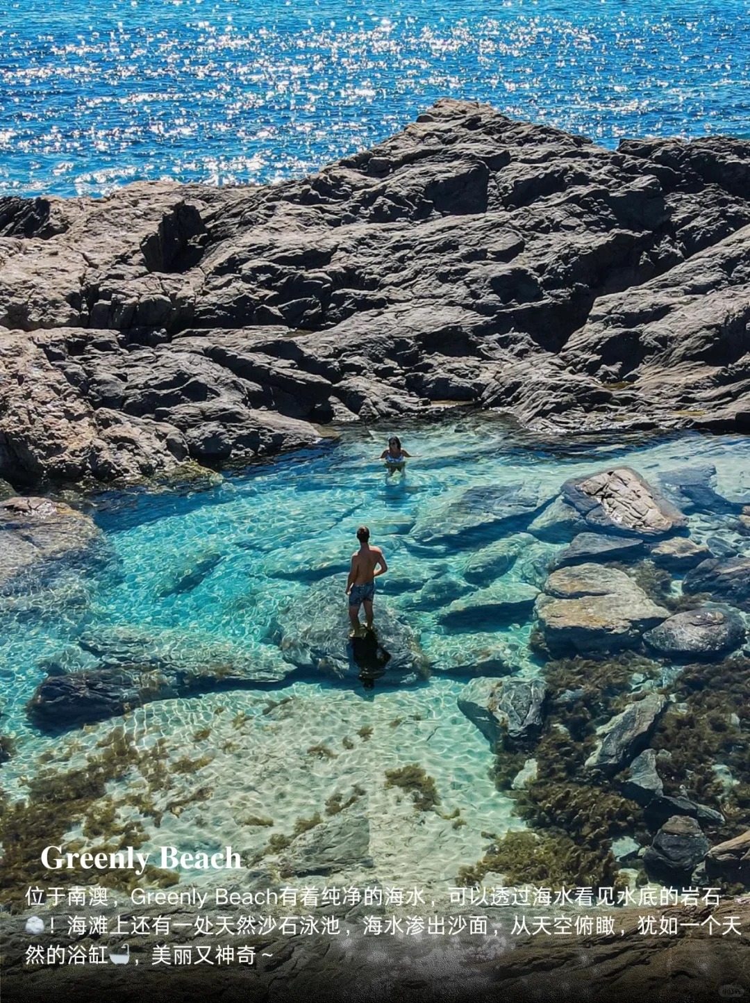 南澳的Greenly Beach以其清澈见底的海水而闻名,你可以清晰地看到海底的岩石🪨。海滩上还有一个由自然力量雕琢的沙石泳池,海水在沙面上汇聚,从空中看去,宛如一个天工开物的浴缸🛁,既美丽又充满神秘。