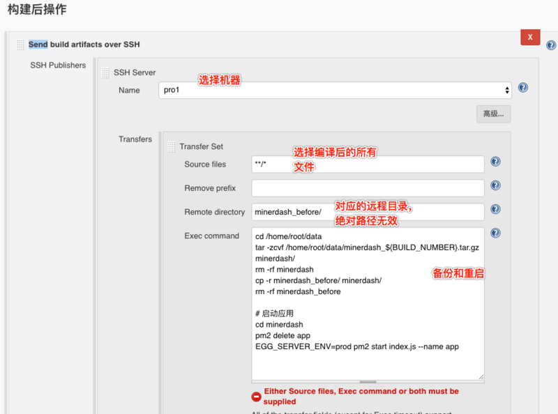 Publish Over SSH的时候指定的。 - Exec command 意思就是在文件全部发送到远程机器,执行以下的脚本。建议先备份之前的工作目录,方便回滚代码
