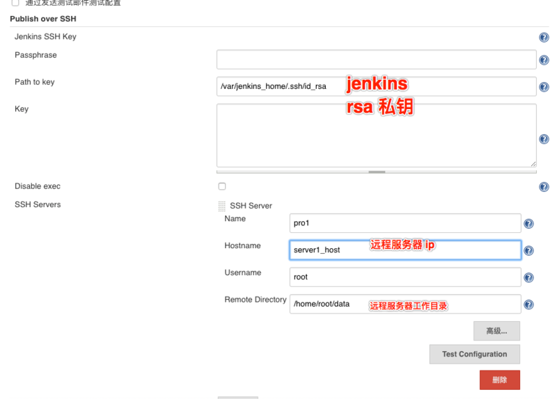 Remote Directory,jenkins 推送过去的文件都会出现在这个目录,设置远程服务器的绝对路径有可能无效。使用相对路径即可。如果有多台机器,都在这里进行配置。另外,需要把 Jenkins 的公钥,添加到 server1-3 的