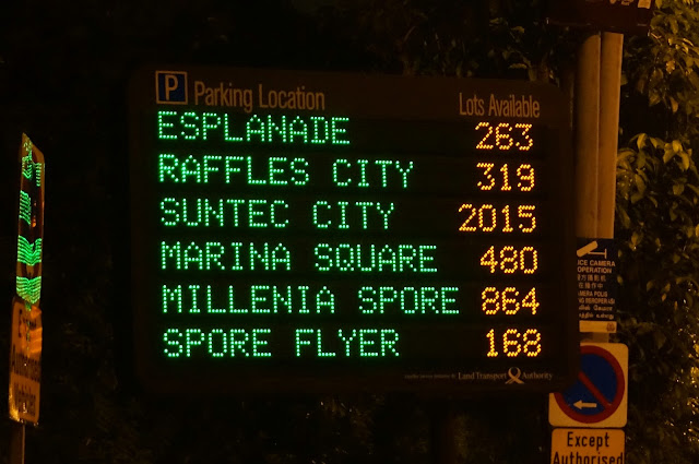 在Esplanade Drive的橋口發現一個為方便駕駛人士而設,提供Marina Bay區內泊車資訊的牌子,實在是新加坡政府其中一項德政,讓駕駛人士不必為找車位而徬徨,當中Suntec City還真是大,竟然有超過二千個車位,實在是很厲害