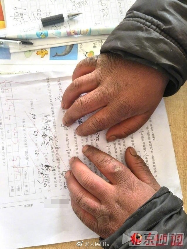 照片男孩所在班级有17个人,当天上午期末考试考的是语文,照片男孩的语文成绩一般,数学比较好,在班级成绩是中等水平。男孩的家庭,父母都在外地务工,家里有兄弟姐妹几人,都是留守儿童。这张照片是孩子的数学考试卷子打了99分与孩子被冻伤的手。