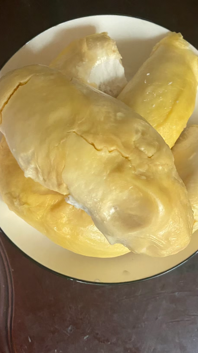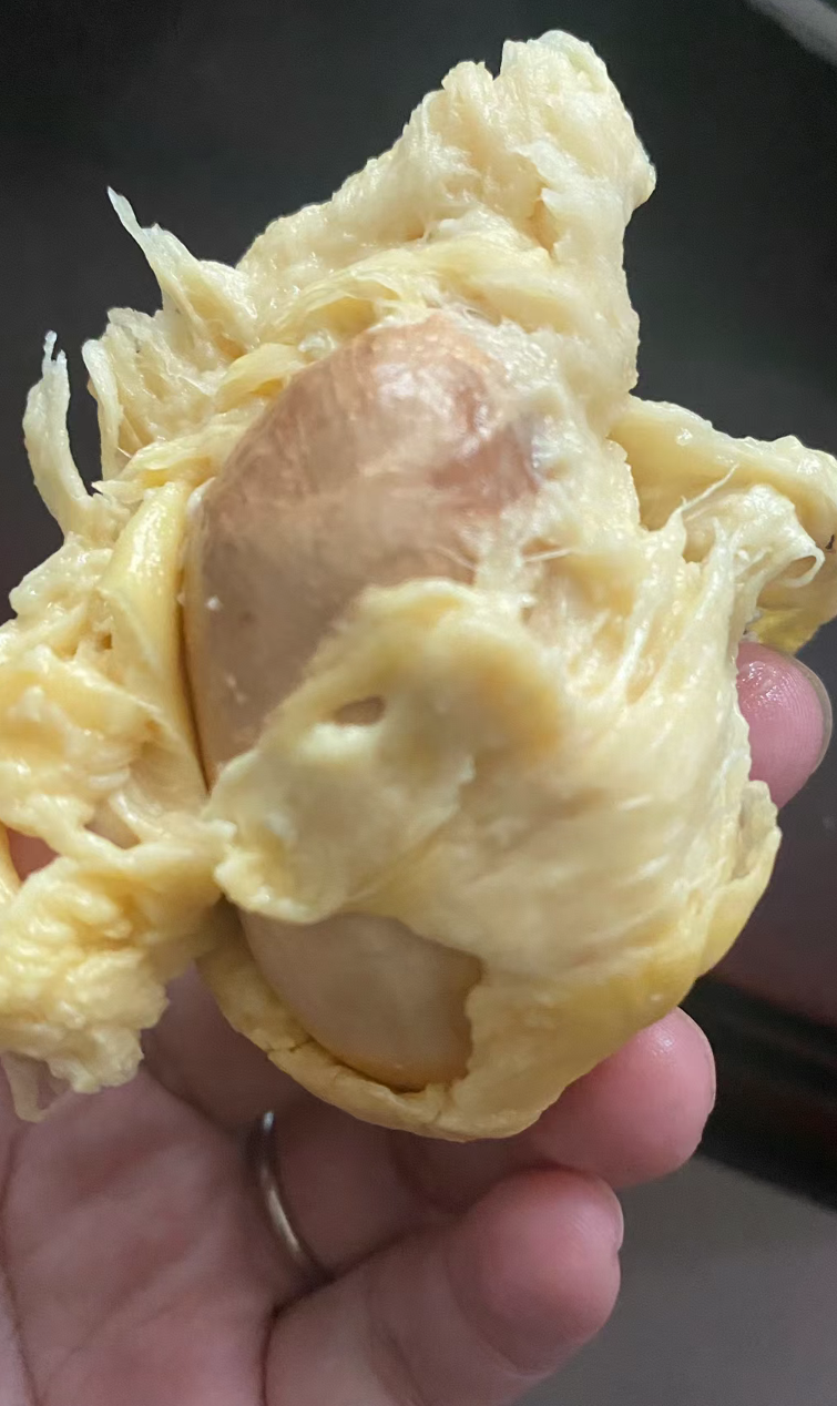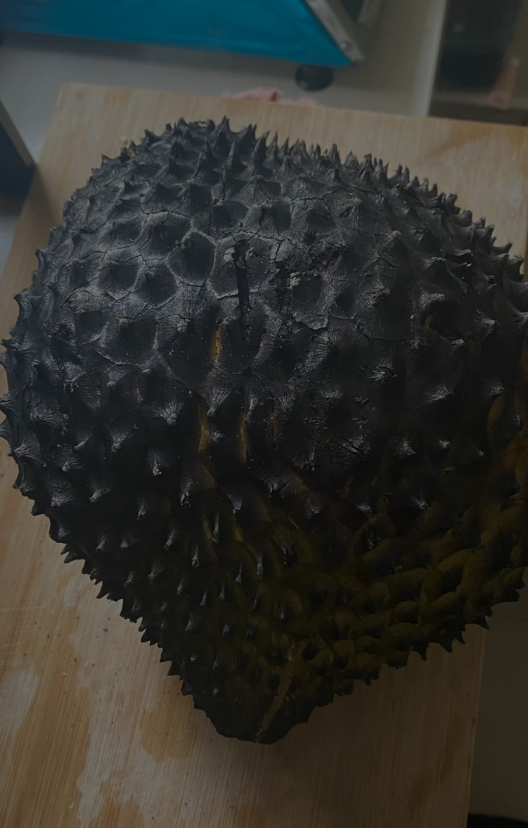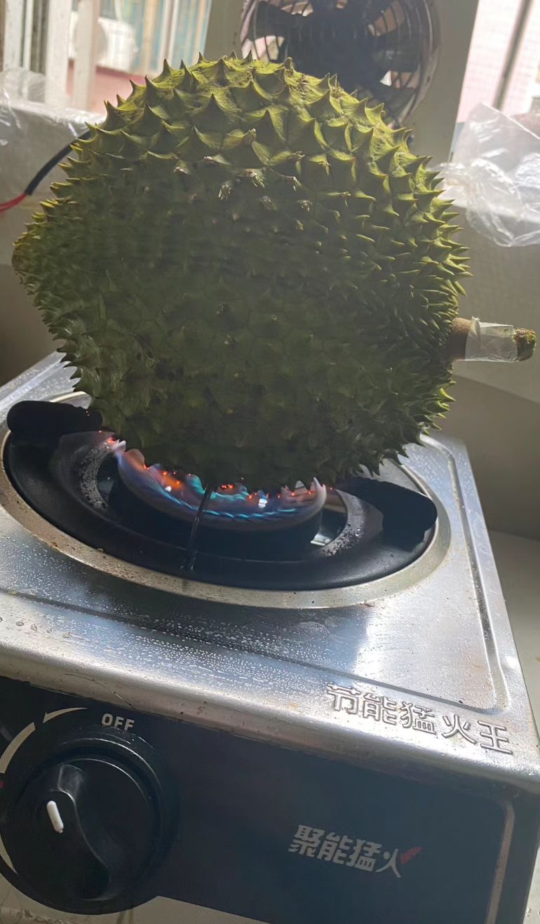 自己在家做烤榴莲!spexxxxxx (32)in #cn • 2 years ago 第一次烤榴莲,买来还是青绿色的,但是又很想吃,查一下说可以烤着吃,就开干了。 刚烧的时候,有点像在烧柴火,没什么别的味道,越来越黑,慢慢就开裂了,但是还是没有闻到香味。 四周烤完大概15分钟左右,怕烤过了,表皮有点烧焦的味道,打开发现有的还没烤熟,热乎乎还挺香的,又放进空气炸锅了,200°15分钟,表面有点小焦,吃起来有点像冻干榴莲,有点甜腻。网上说很好吃,但是我还是感觉自然熟的更加清香。而是这个是干尧榴莲,核真的很大。158就这么一盘没了。#榴莲