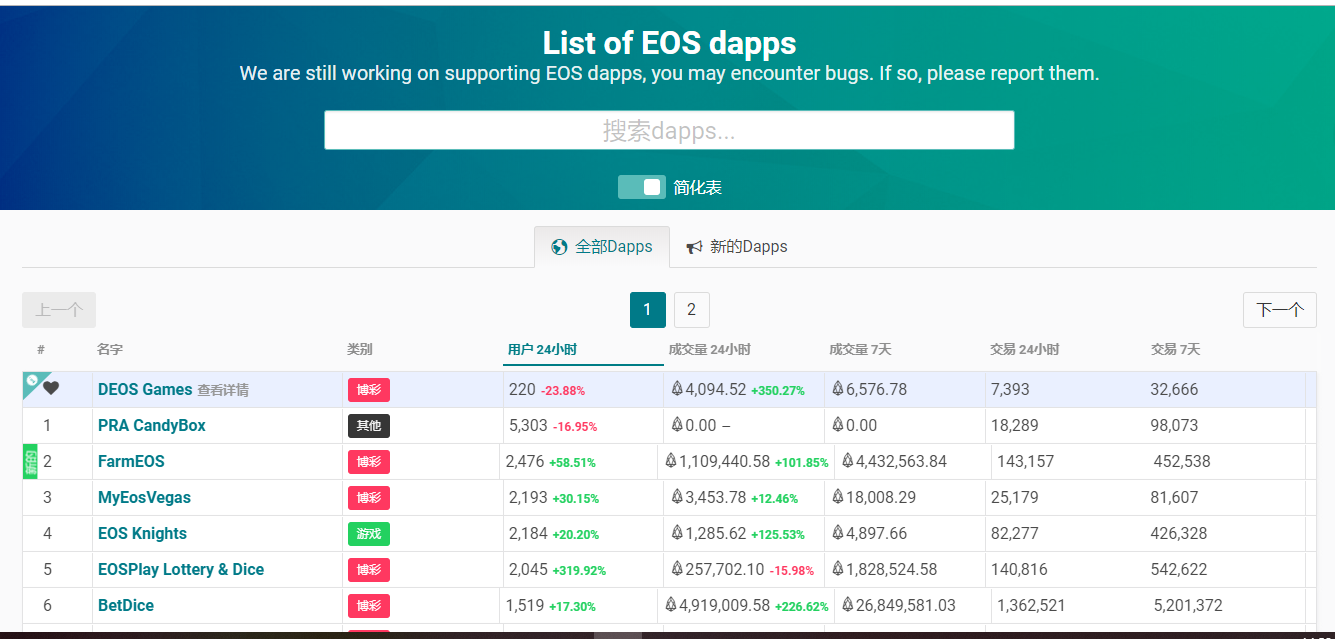 2 EOS DAPP每天活跃人数的查询每天都有哪个新dapp上线,每天都有多少人在这个dapp上玩耍。https://www.dappradar.com/eos-dapps