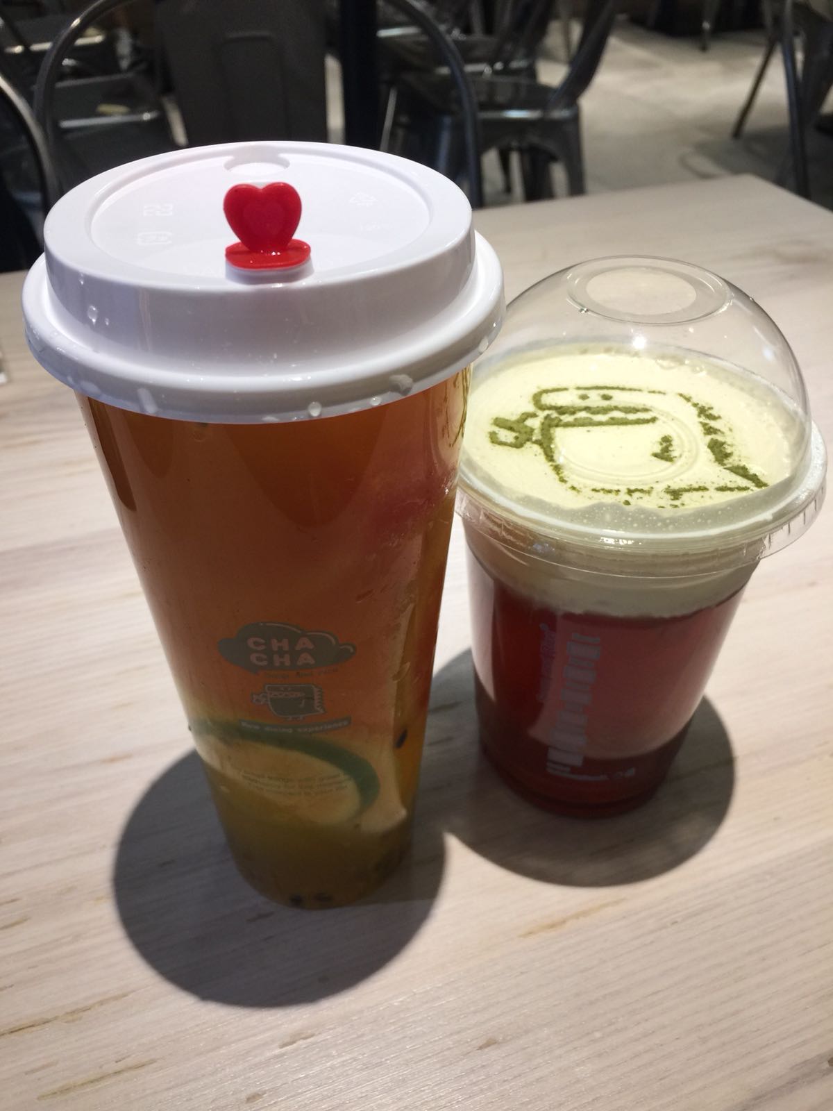 最後就係呢兩杯飲品,女朋友嘅係左邊嘅超級水果綠妍,入面有大大塊西瓜,仲食到粒粒熱情果,味道酸酸甜甜咁,好清新。 而我揀嘅芝士紅玉,都好好飲!芝士味濃得嚟唔會太杰,我慣咗先啜咗上面嘅芝士先,然後先再飲下面嘅茶,單單啜芝士嘅時候完全唔會覺得好膩,飲到咁上下,芝士同茶混合咗之後都仲好好飲!
