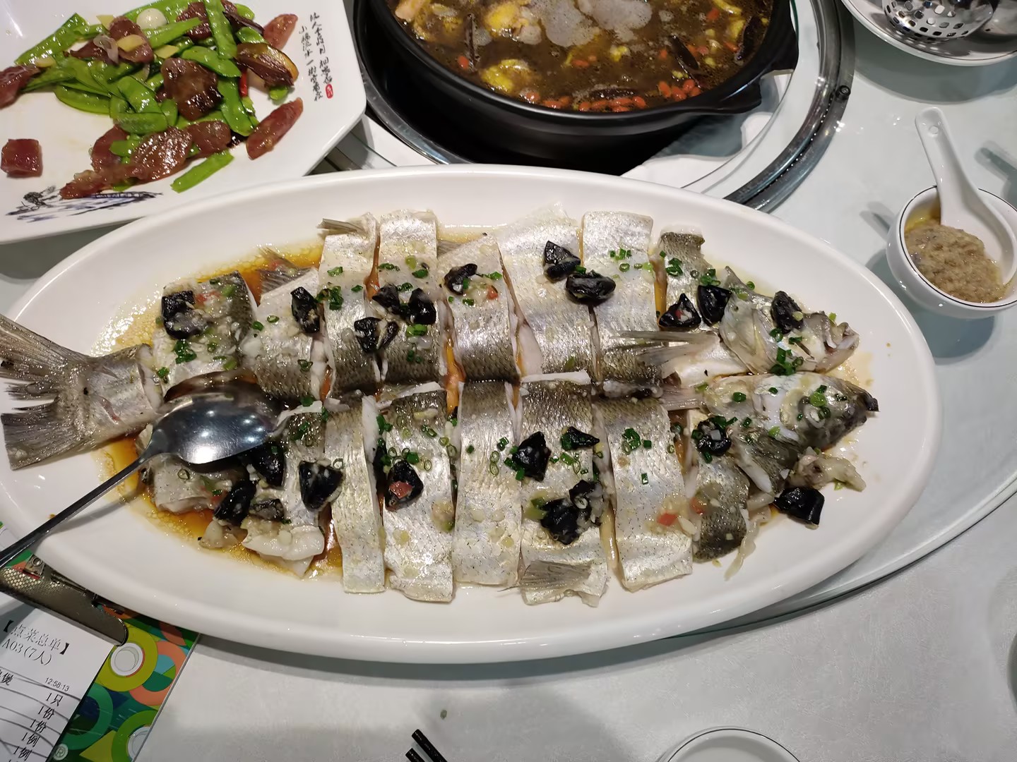 酒店的菜肴十分丰盛,我拍了不少照片。有一条2斤多重的和顺鱼,体型较大,口感鲜美,这次做了切块处理。梁还从家里带来了他母亲自己种的荷兰豆,交给店家用香肠炒的,别有一番风味。