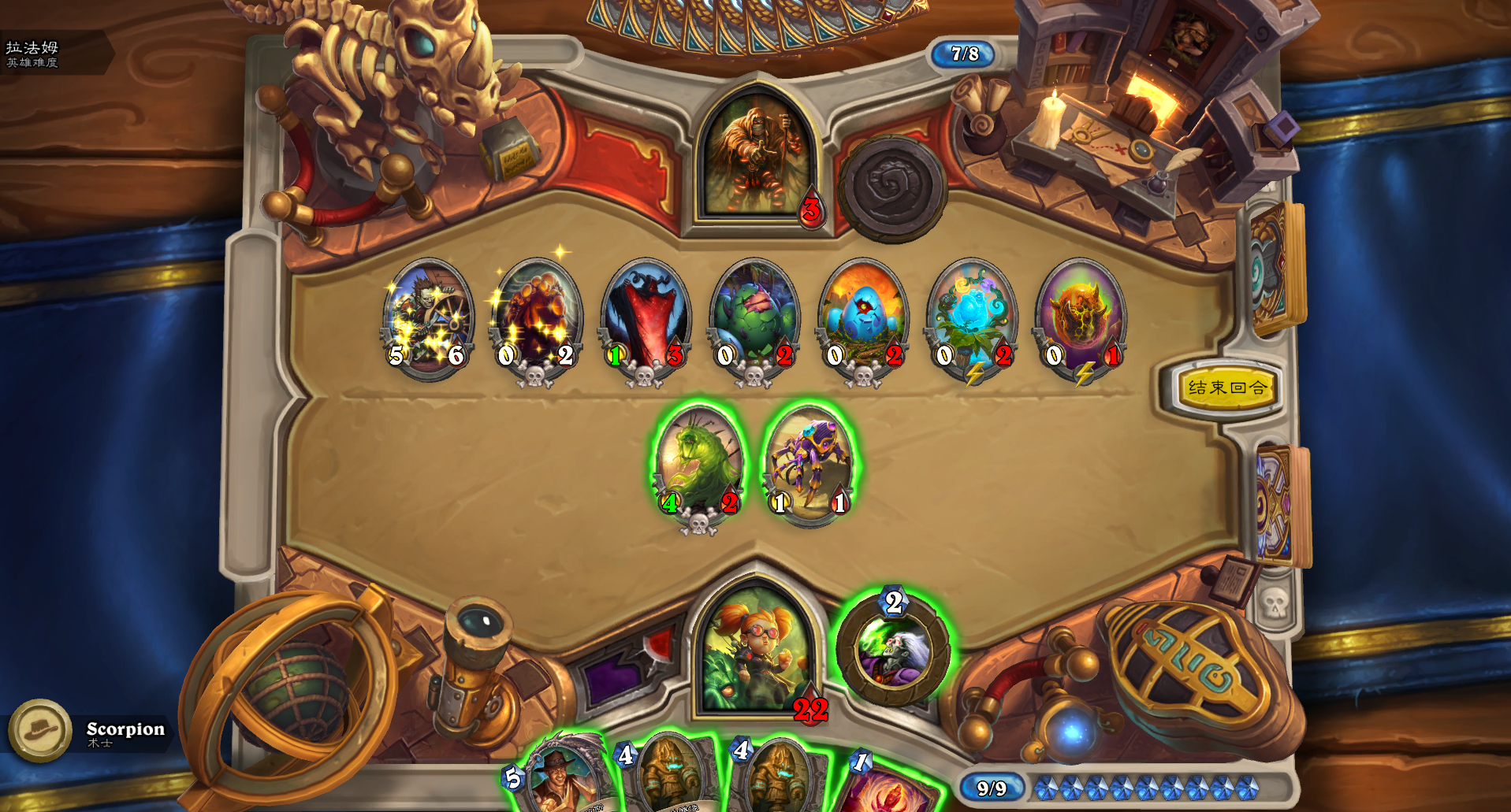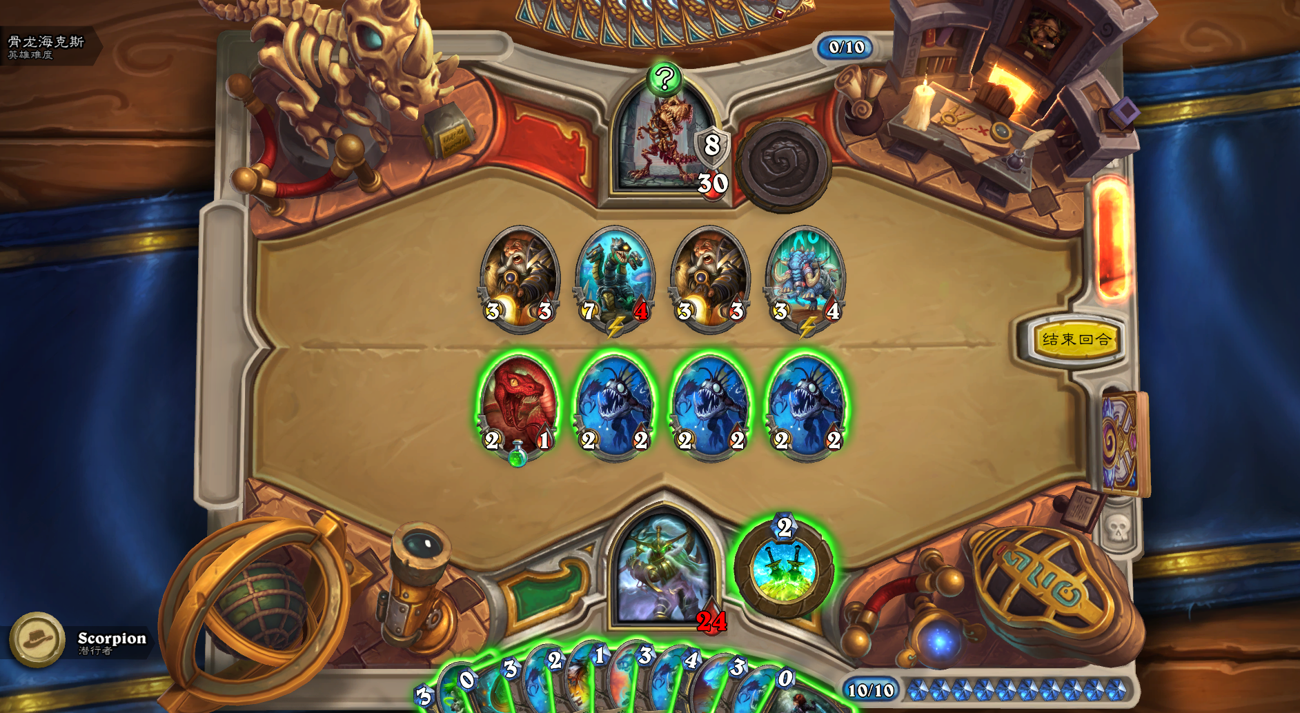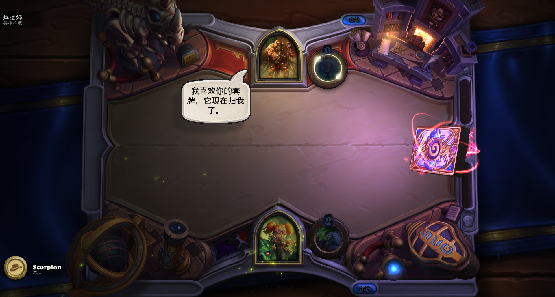 不过没关系,现在都这么多个版本过去了,用新的卡组通关应该不成问题,可我还是想用经典的卡组尝试一番,于是组了一套爆牌贼对战第一个BOSS——骨龙海克斯。