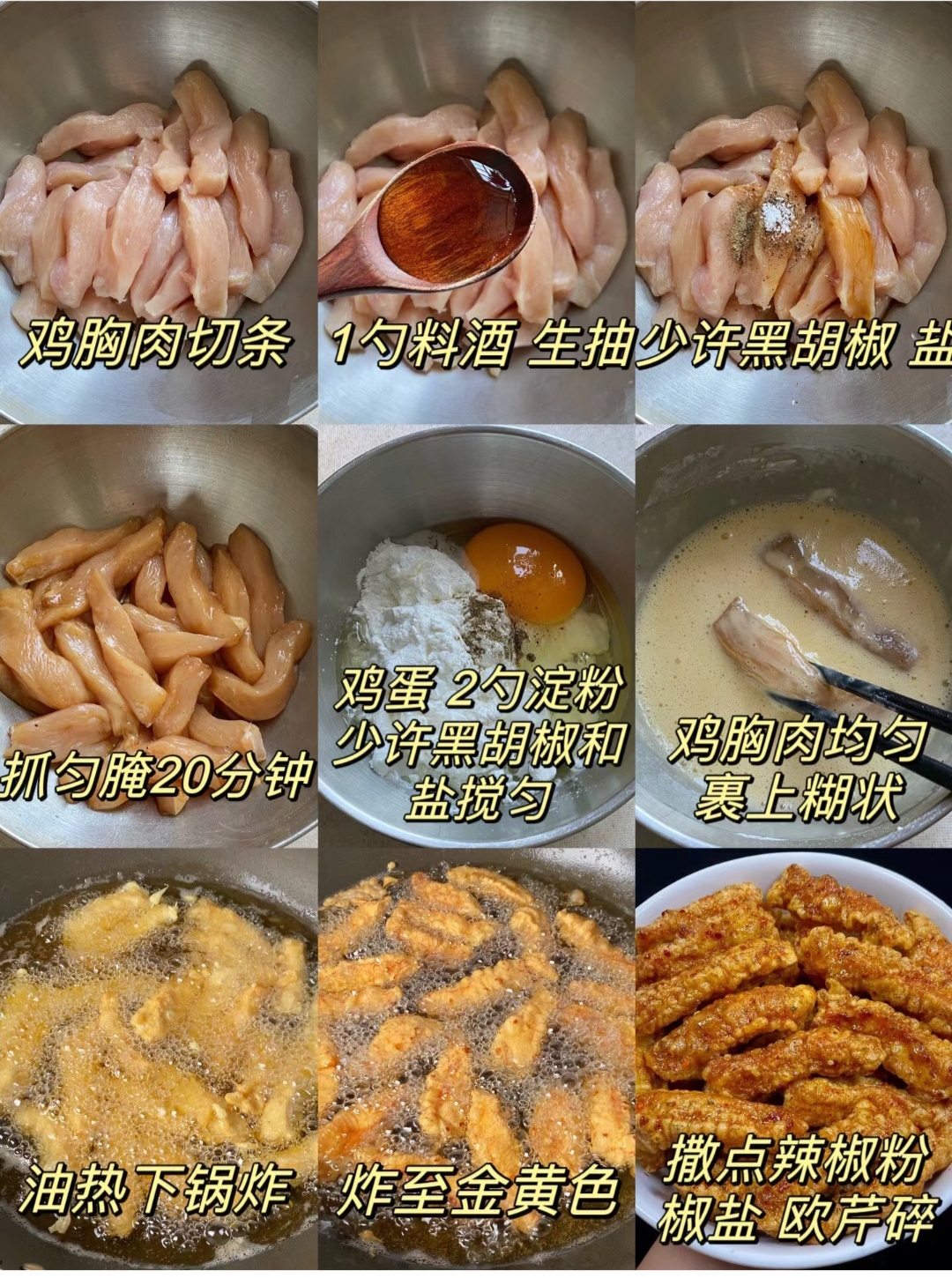 好吃到舔手指!这配方怎么不早点发现!!tangya (32)in #cn • 2 years ago 酥脆的椒盐鸡胸肉条真的是香迷糊啦!外酥里嫩,咸香美味,撒点喜欢的调料,一口咬下去香脆可口,满嘴肉香,好吃到舔手指!香辣过瘾,越嚼越香,在家就可以做出炸鸡店味道,全家人吃完都赞不绝口 做法步骤如上图集中所示