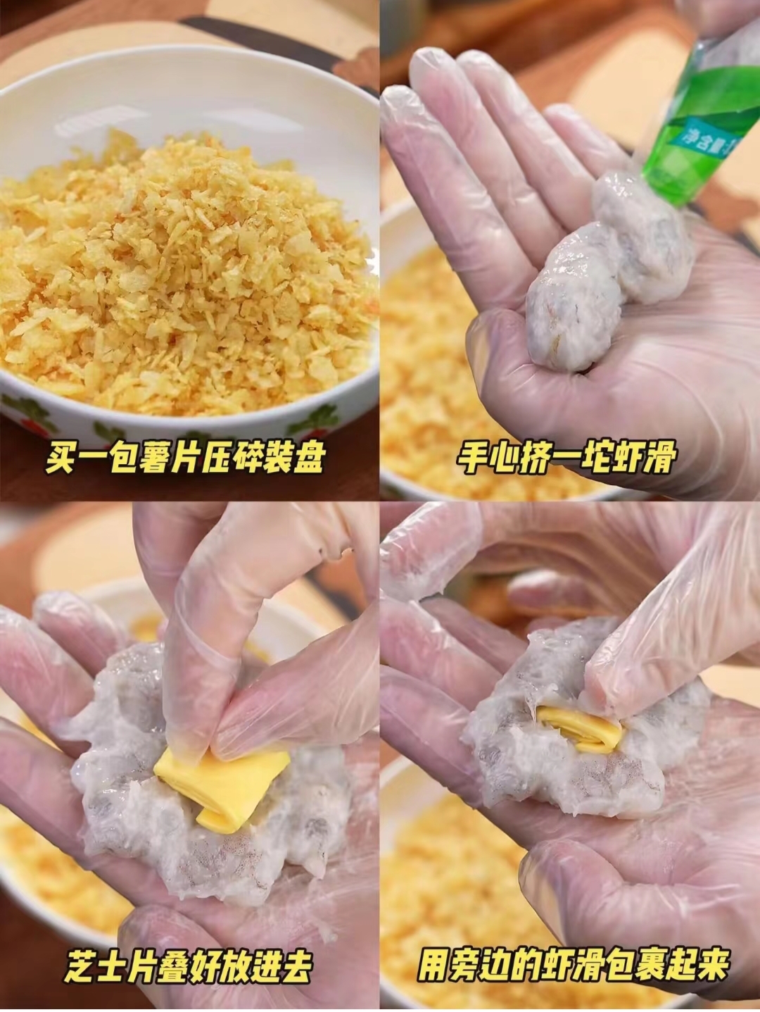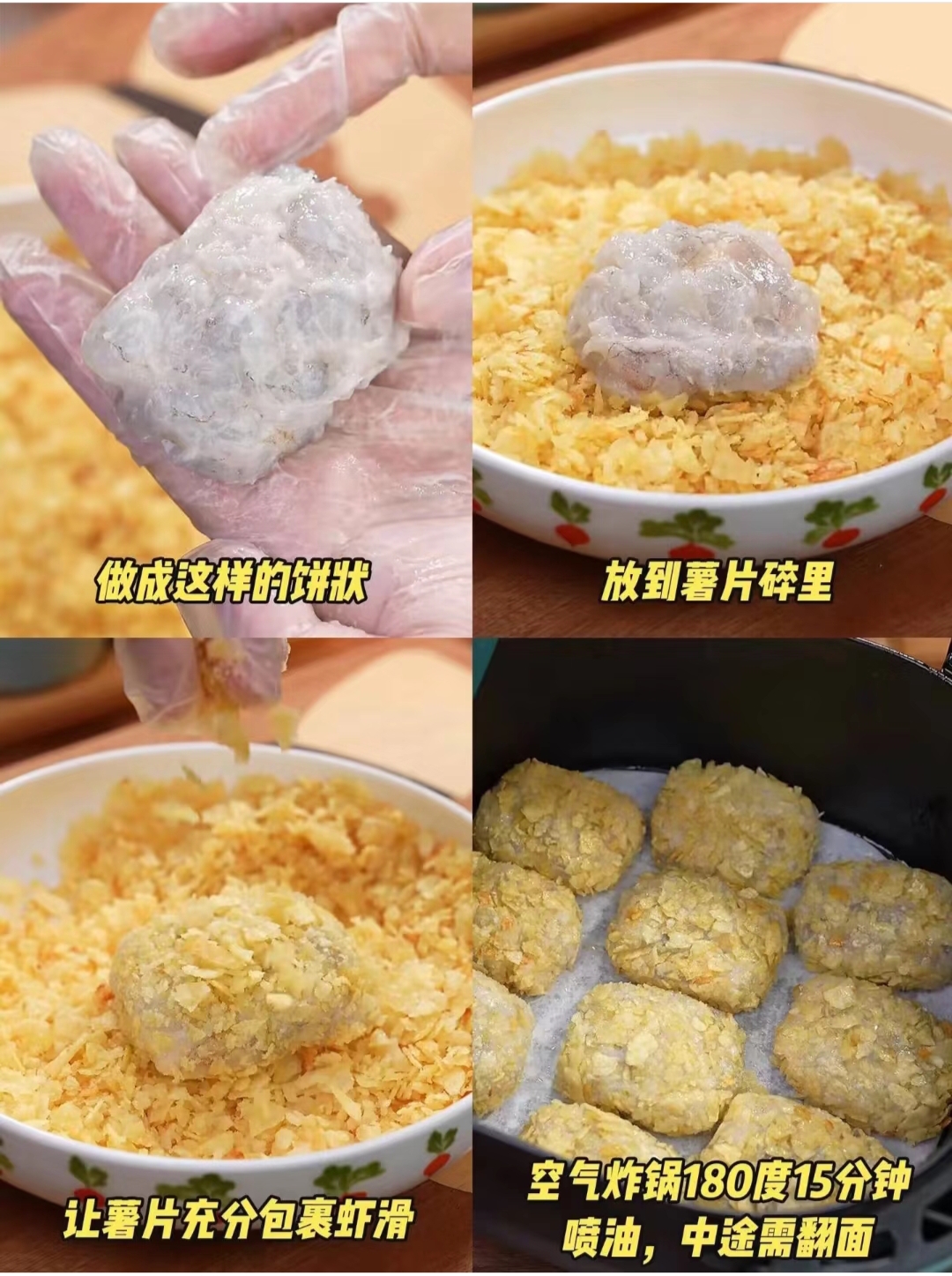 到底谁发明的天花板吃法!巨巨巨…巨好吃steemCreated with Sketch.tangya (32)in #cn • 2 years ago 会爆浆的芝士虾滑薯饼真的是太哇塞了!!外酥里嫩!!!爆浆的口感!!芝士控真的不要错过了!!! 脆脆的薯片包裹着嫩嫩的虾滑!真的吃一辈子都不会腻!!! 材料:虾滑、薯片、芝士片 RED 做法如图!!有手就会!翻车?不可能的!! 1将薯片敲成碎末状 取一坨虾滑,包入芝士片 在薯片上翻滚,捏成饼状,让薯片包裹住整个虾滑 4喷油,空气炸锅180℃烤15分钟即可,中途需翻面