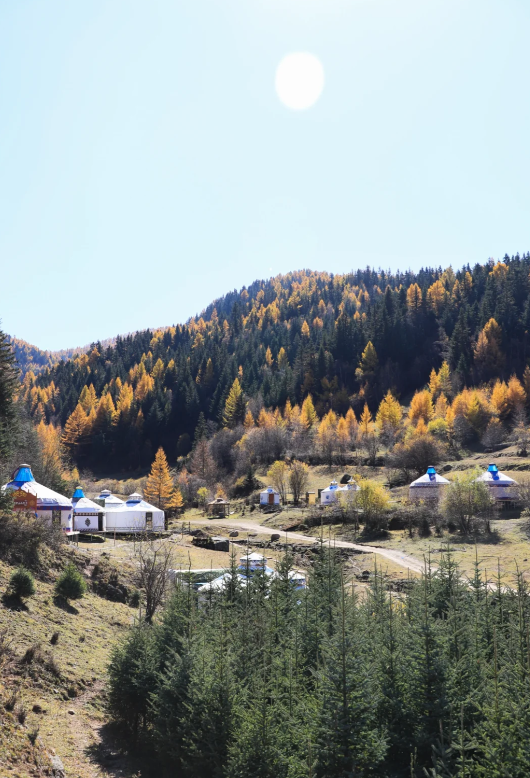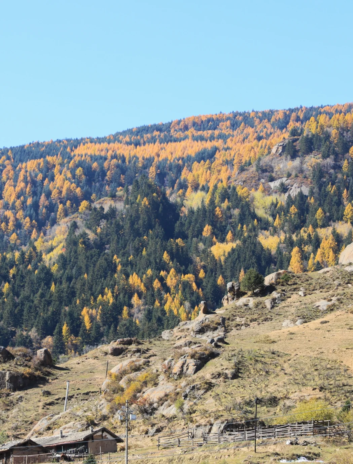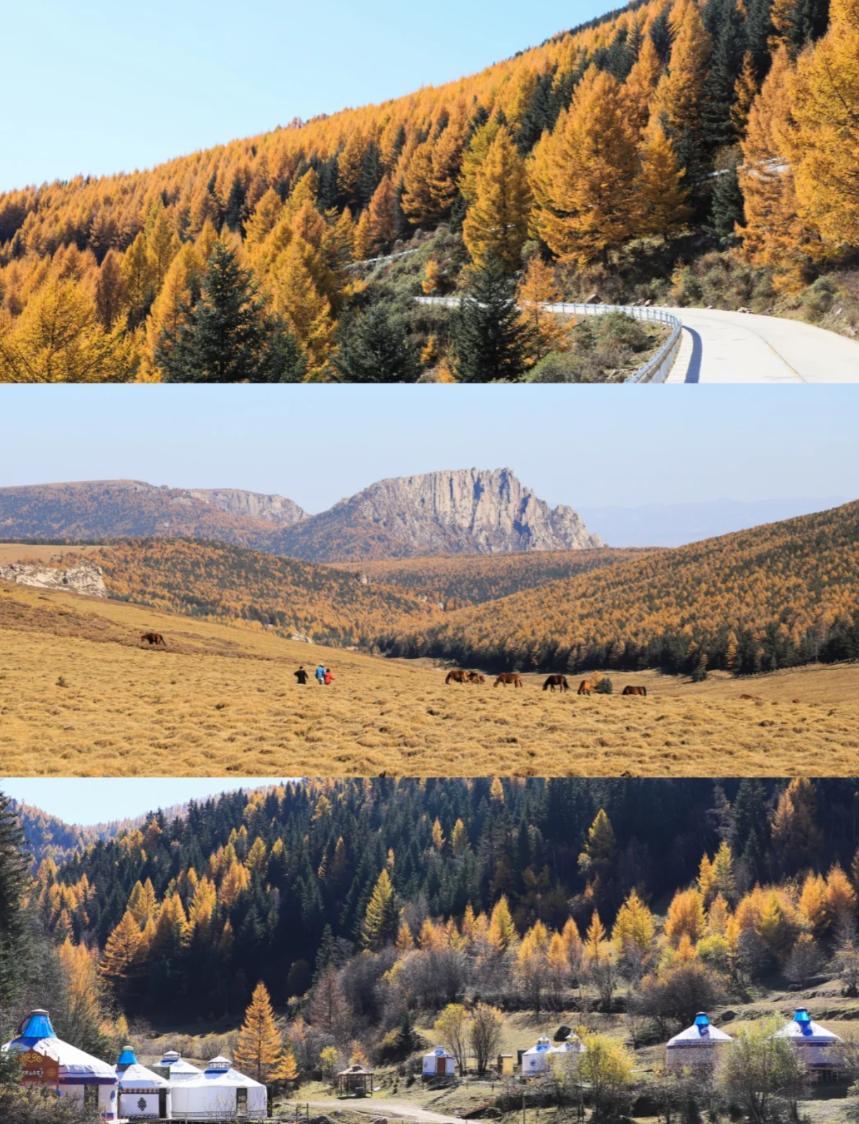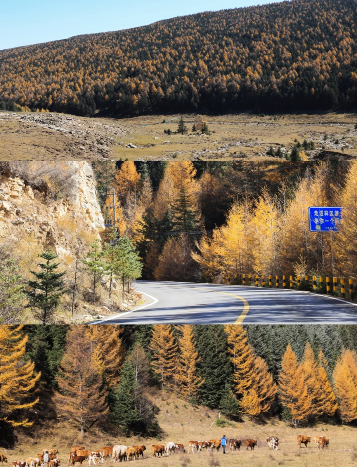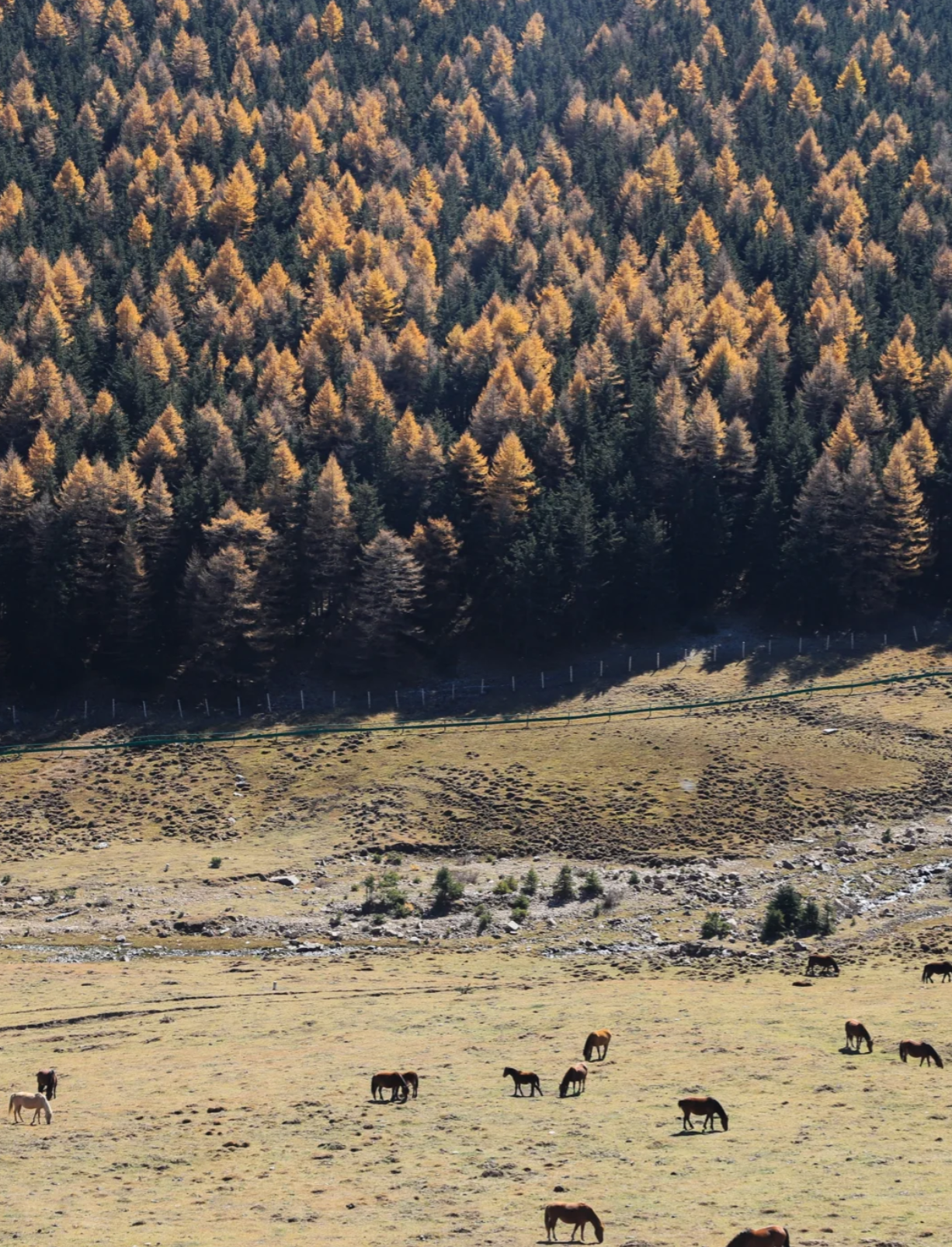 这里有绝美的秋景,小河,溪水,峡谷,羊群,牛儿悠闲地嗮着太阳吃着草,马儿自己放自己,金黄的针叶林,漫山遍野,层林尽染,美不胜收;