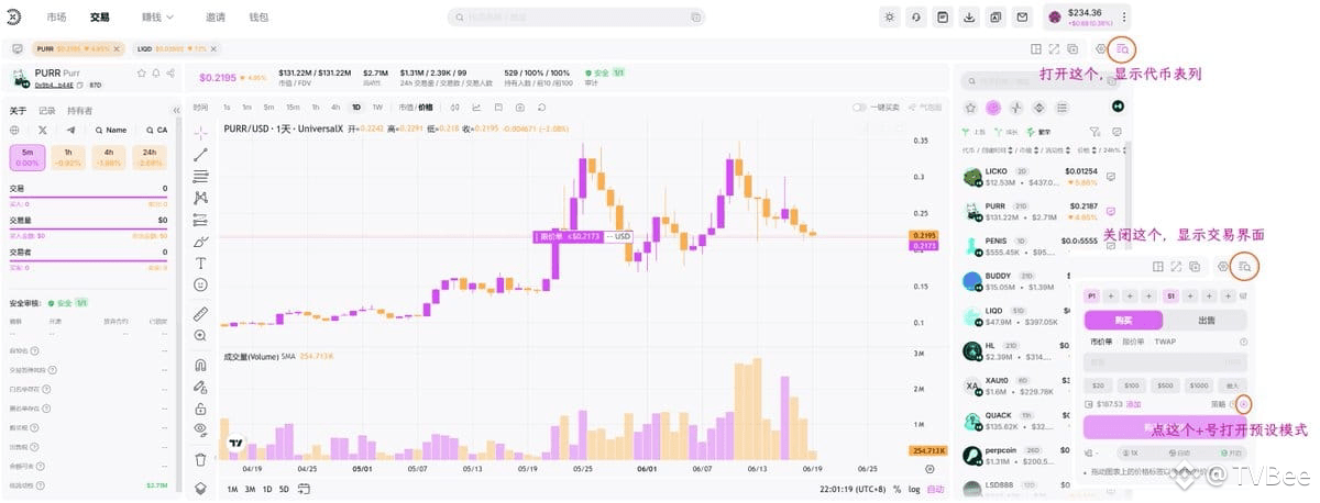 UniversalX直接列出了HyperEVM生态的代币,在这里一看才知道,HyperEVM生态市和流动性最大的MEME是**$PURR**,市值已经达到1.3亿美元。