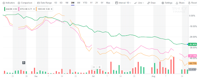 綠色的是亞航,粉紅色的是國航,橙色的是南航,相較之下,泰國的航空表現已經非常不錯了,最差的亞航才跌26%,國航及南航分別下跌了37%及44%,實在慘不忍睹。