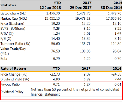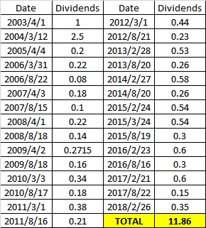 上表可見,2003年起,已派息接近12銖,目前股價大約10銖,一直以來平均分紅一直平均有7-8%,簡單算了一下,由於之前股價還比較低,即大約持有不到10年已完全回本,目前等於0成本持股,絕對比包租公回本更快(炒房的另計),但近期分紅有所減少,預計本年度仍有超過5%的分紅。