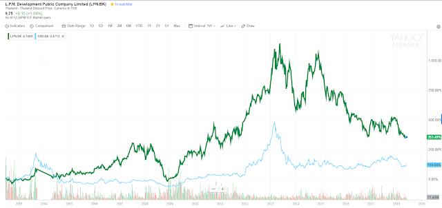 可能大家只是把LUMPINI作為收息工具,但令人驚訝的是,LUMPINI的股價也非常牛氣,下圖是2003起至今,LUMPINI跟SANSIRI的股價比較,LUMPINI居然大幅跑嬴另一主要開發商SANSIRI,真的是財息兼收。不過近期股價隨着大市亦有明顯回調,可能也是個吸籌機會,大家可以關注。