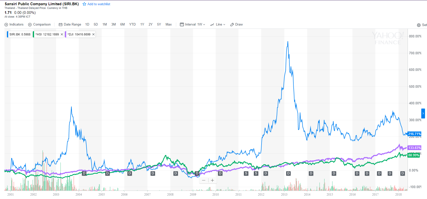 藍色是SANSIRI從2001年至今的股價走勢,而綠色及紫色分別是香港恒生指數及美國道瓊斯指數