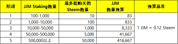 可一半儿的价格购买Steem的限制数量 : 根据JJM Staking数量来分开5各阶段