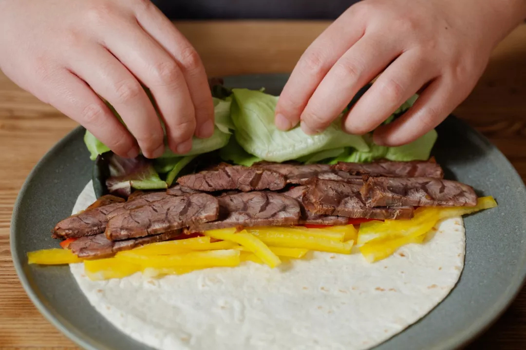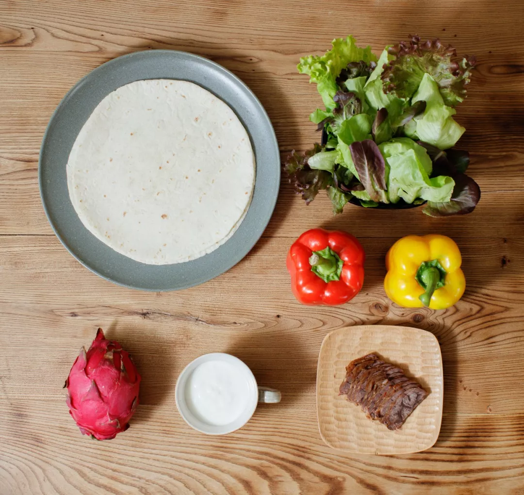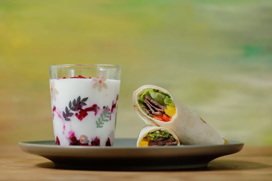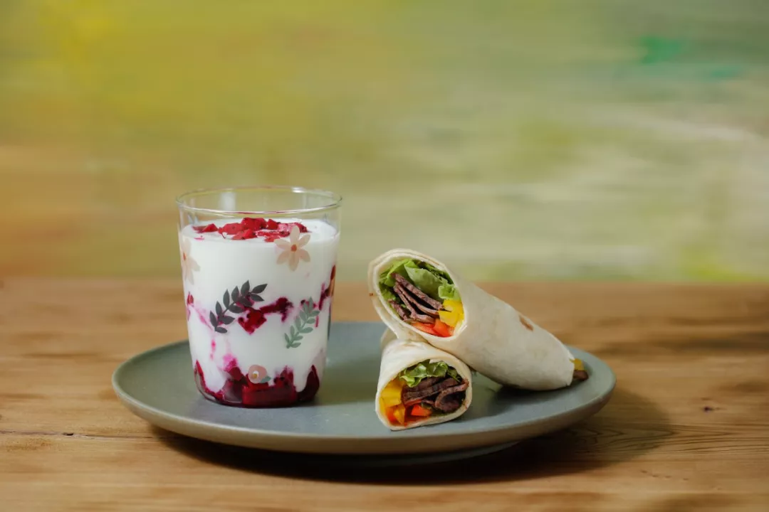 很多很多蔬菜、切片牛肉、一杯酸奶