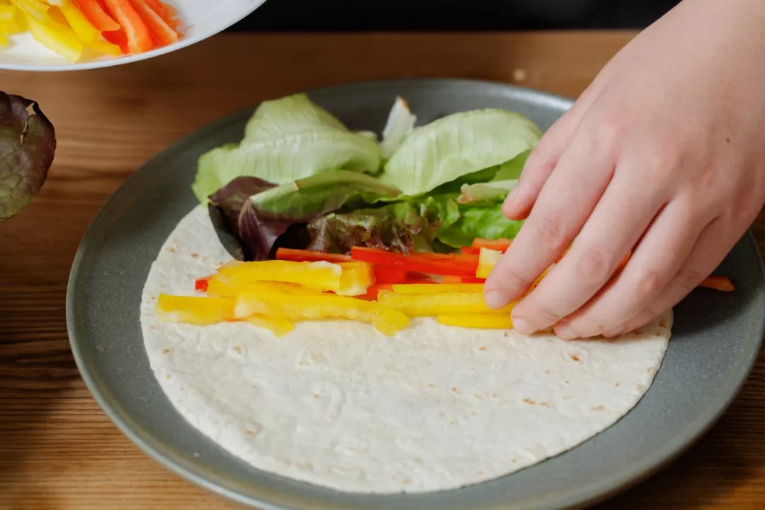 將切好的彩椒絲放在餅裏,順便把很多很多蔬菜也往裏塞塞塞,直到塞不下為止。