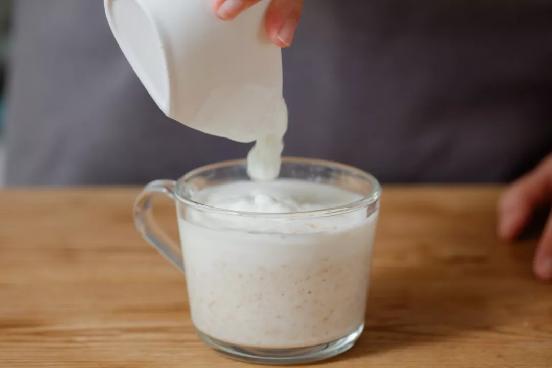 隔天晚上,要提前做好燕麥杯,將燕麥倒入杯中,倒入牛奶和酸奶,攪合攪合!