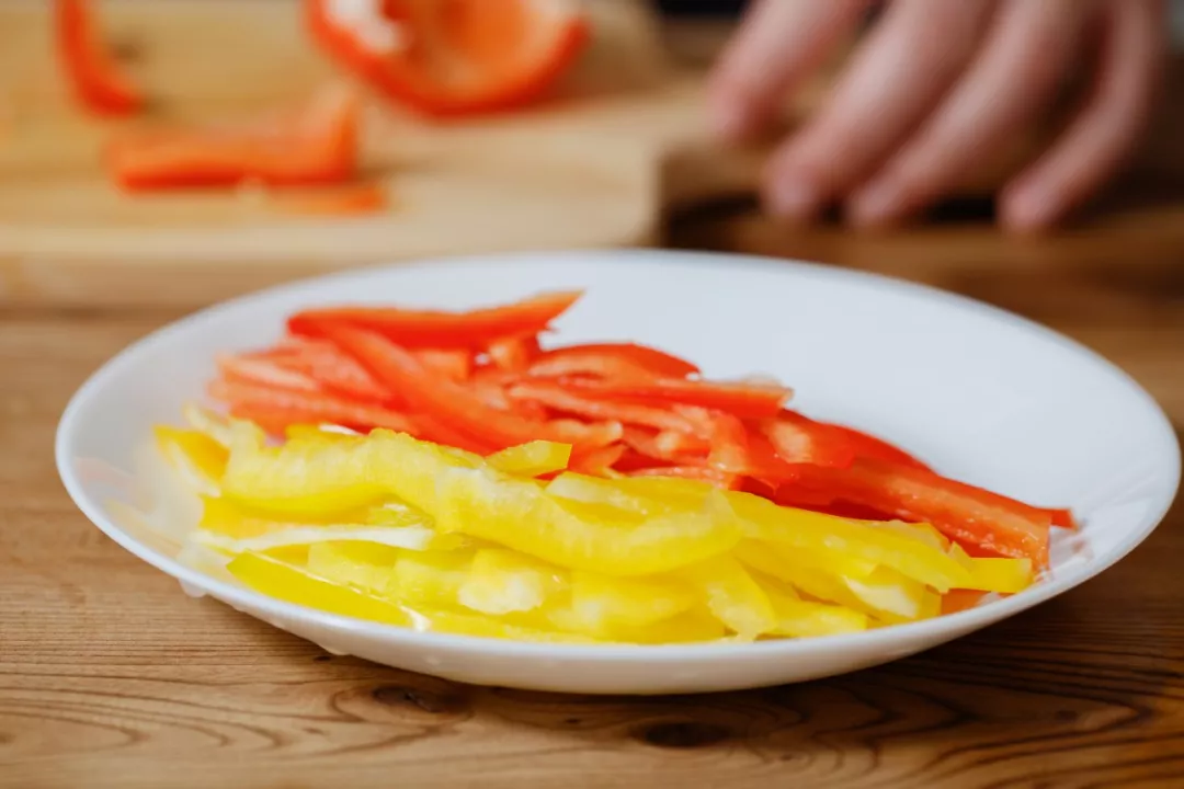 把彩椒洗洗幹凈,拿刀嘩啦切開,紅彩椒和黃彩椒各切一半,不喜歡吃生彩椒的同學,可以把彩椒絲放在平底鍋裏煎一下。(至於很懶的同學,唯一要求就是食材洗幹凈。)