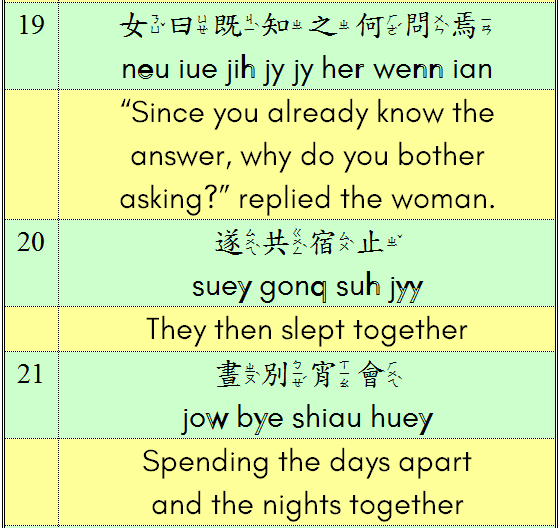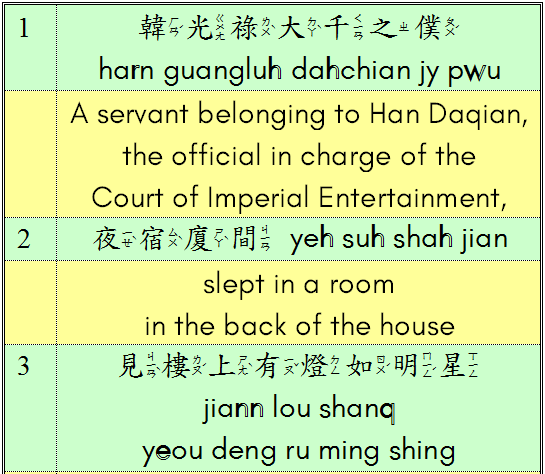 For the time being, I am posting the Chinese text, transcription in GR Tonal Spelling and a fluent (not word-for-word) translation. More details about grammar, vocabulary and pronunciation will appear in the comments below. I would very much appreciate any comments or corrections!