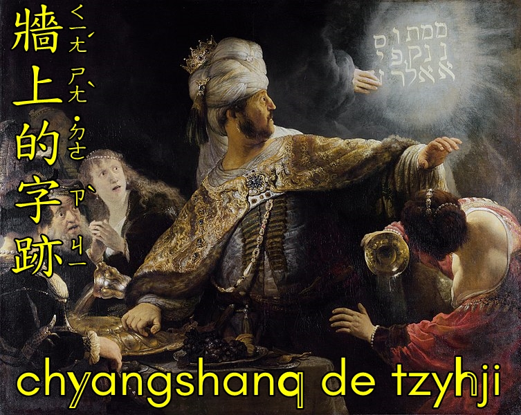 [The Writing on the Wall, by Dutch artist Rembrandt van Rijn 牆上的字跡, 荷蘭畫家的作品: 林布蘭 (Taiwan), 伦勃朗 (PRC)]