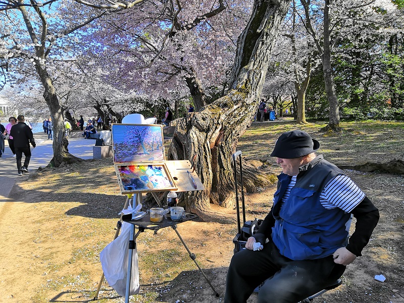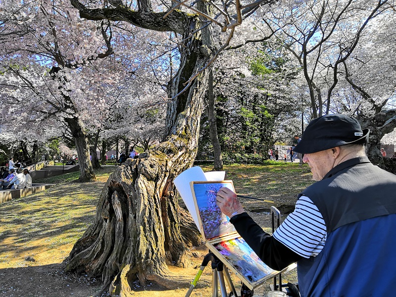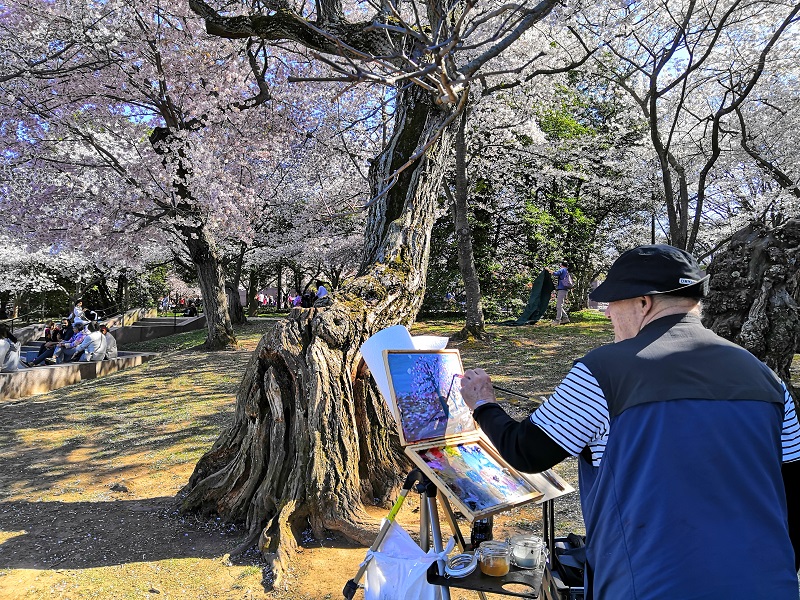 欣赏美丽的樱花时,偶遇一位老画家,正在用手中的画笔记录这美好的景色:
