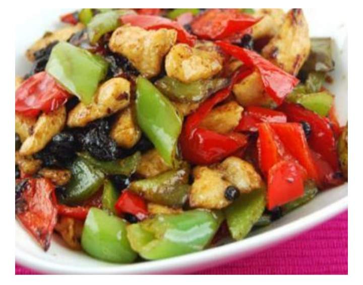 5.炒2分鐘後,放入雞片,調入醬油、白糖,少量鹽,炒勻即可。