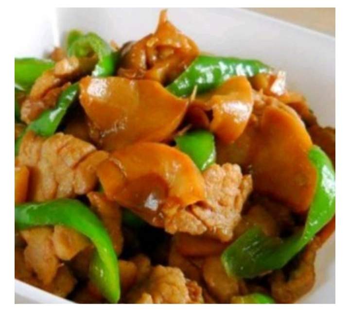 材料:豬肉、杏鮑菇、油、老抽、鹽、生抽、杭椒、蒜瓣、黃酒
