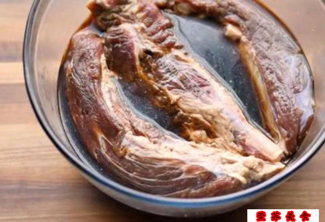 2、把泡好的牛肉, 撈出控幹水分,放入容器中, 倒入醬油 270克。醬油是有黃豆發酵而成的 ,以鹹味為主, 味道非常的濃郁,泡出的牛肉有獨特的醬香味。