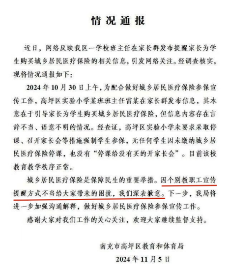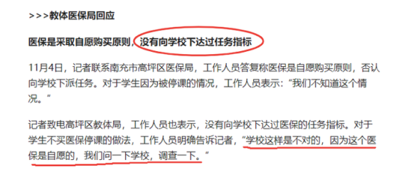 记者联系了当地教体局,教体局工作人员直接表示学校做法是错误的,医保是自愿的,将进行调查。