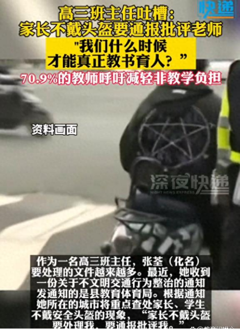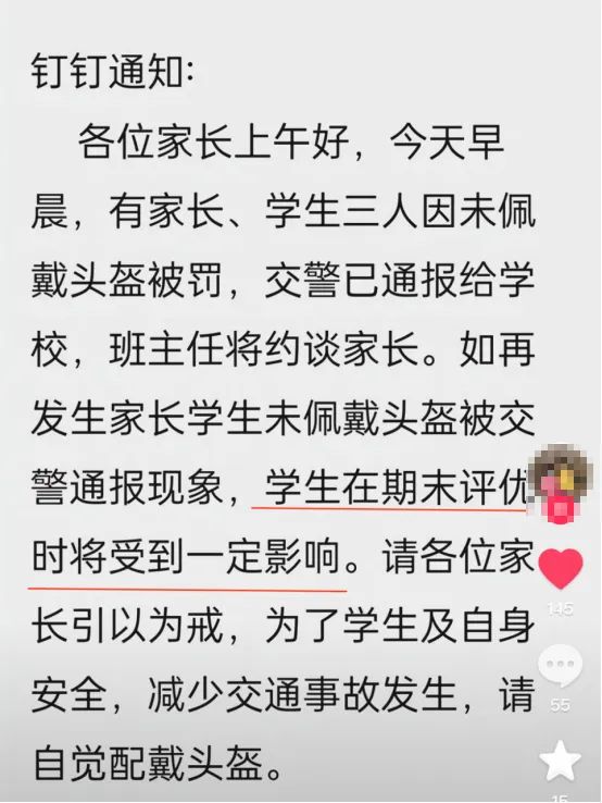 也就是说:家长不戴头盔,受到通报批评的却是老师。