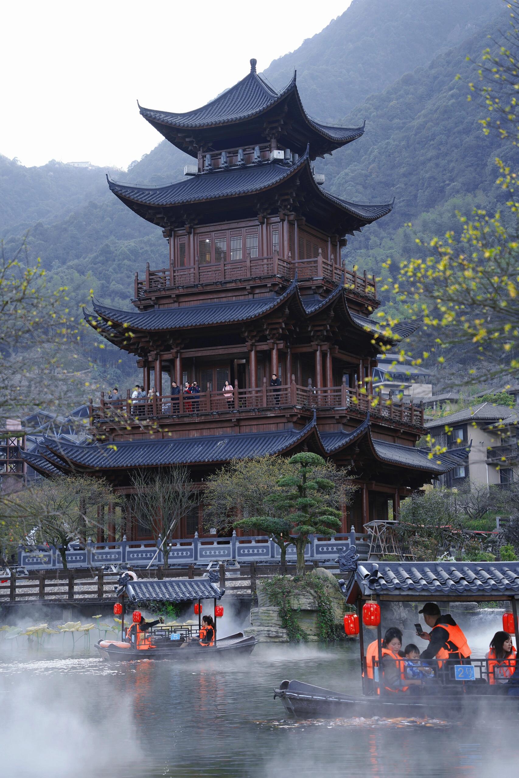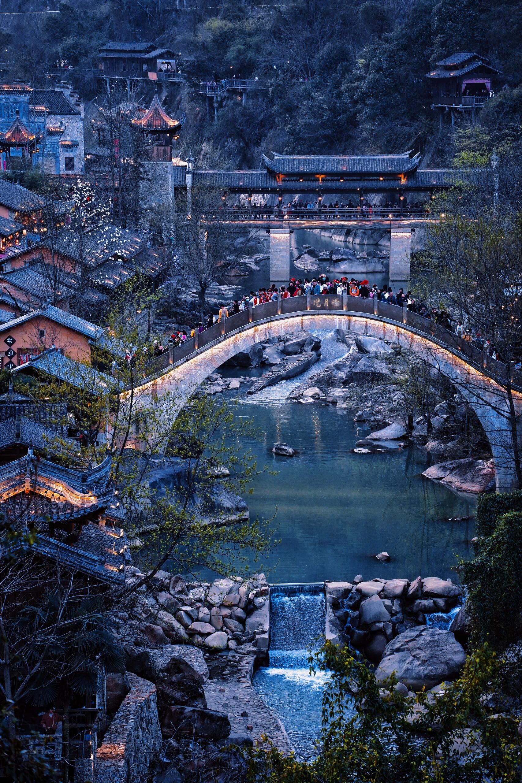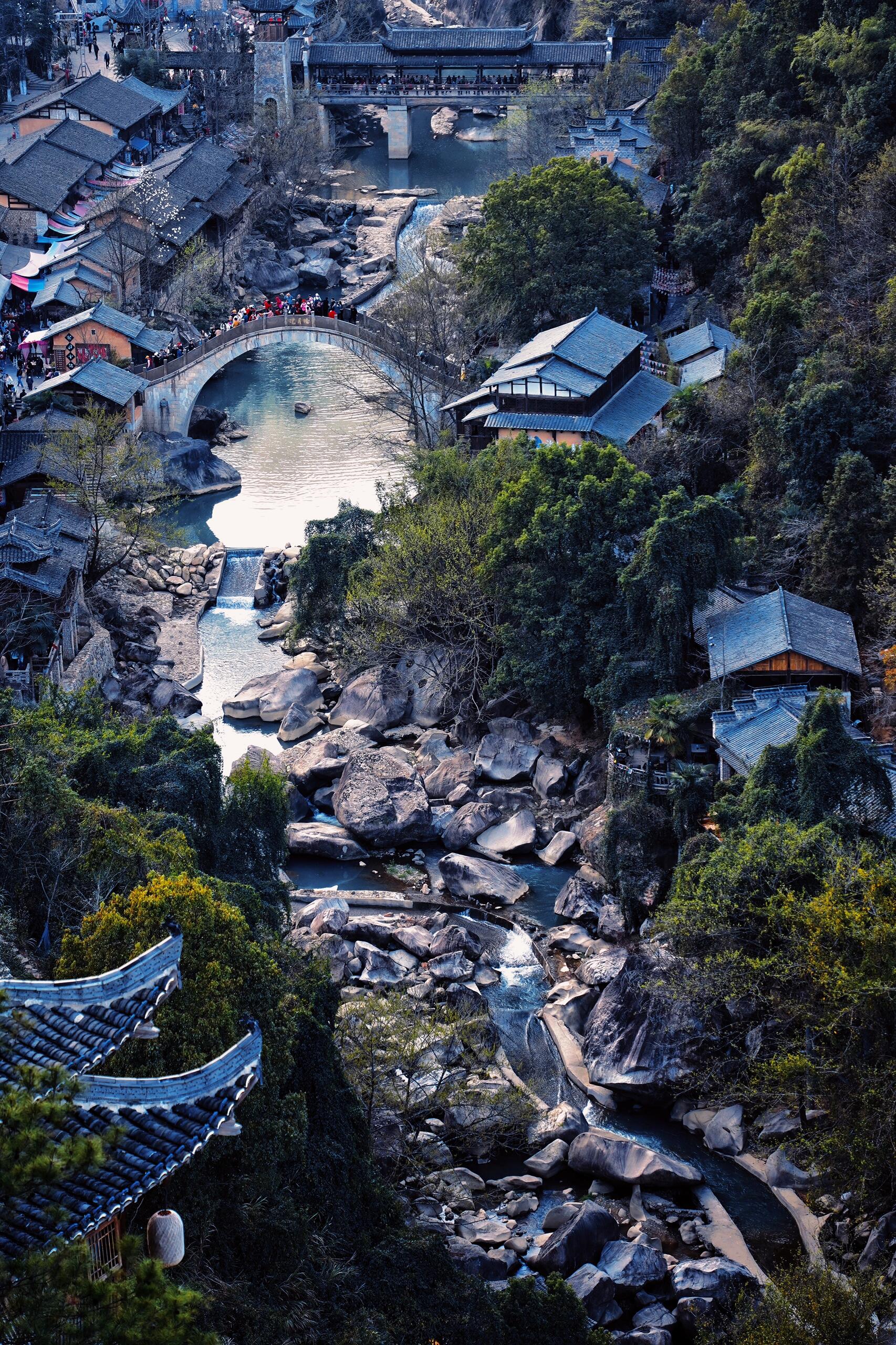 这里有悬崖峭壁上的楼阁,一条蜿蜒的河道。民俗味满满的古街道,远远望去就像一个游戏里的仙侠世界,建议住一晚,黄昏时刻它的美才渐渐展现出来