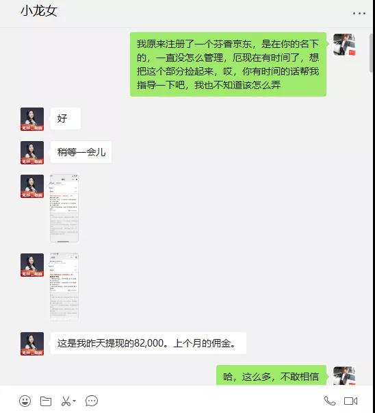 去年分享给我的朋友 ,小龙女现在两个帐号,月入8万,当我看到时都震惊了,这就是我想要的生活,聊聊天,发发朋友圈,收入还不少。