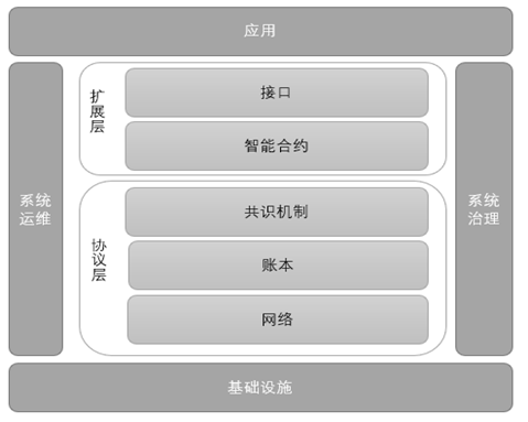 基础设施指的是区块链系统正常运行所需的软硬件环境,应用是基于区块链的业务应用,系统运维是为了保证区块链软硬件正常运行,系统治理更偏重于技术之外规则、规章、制度的建立。