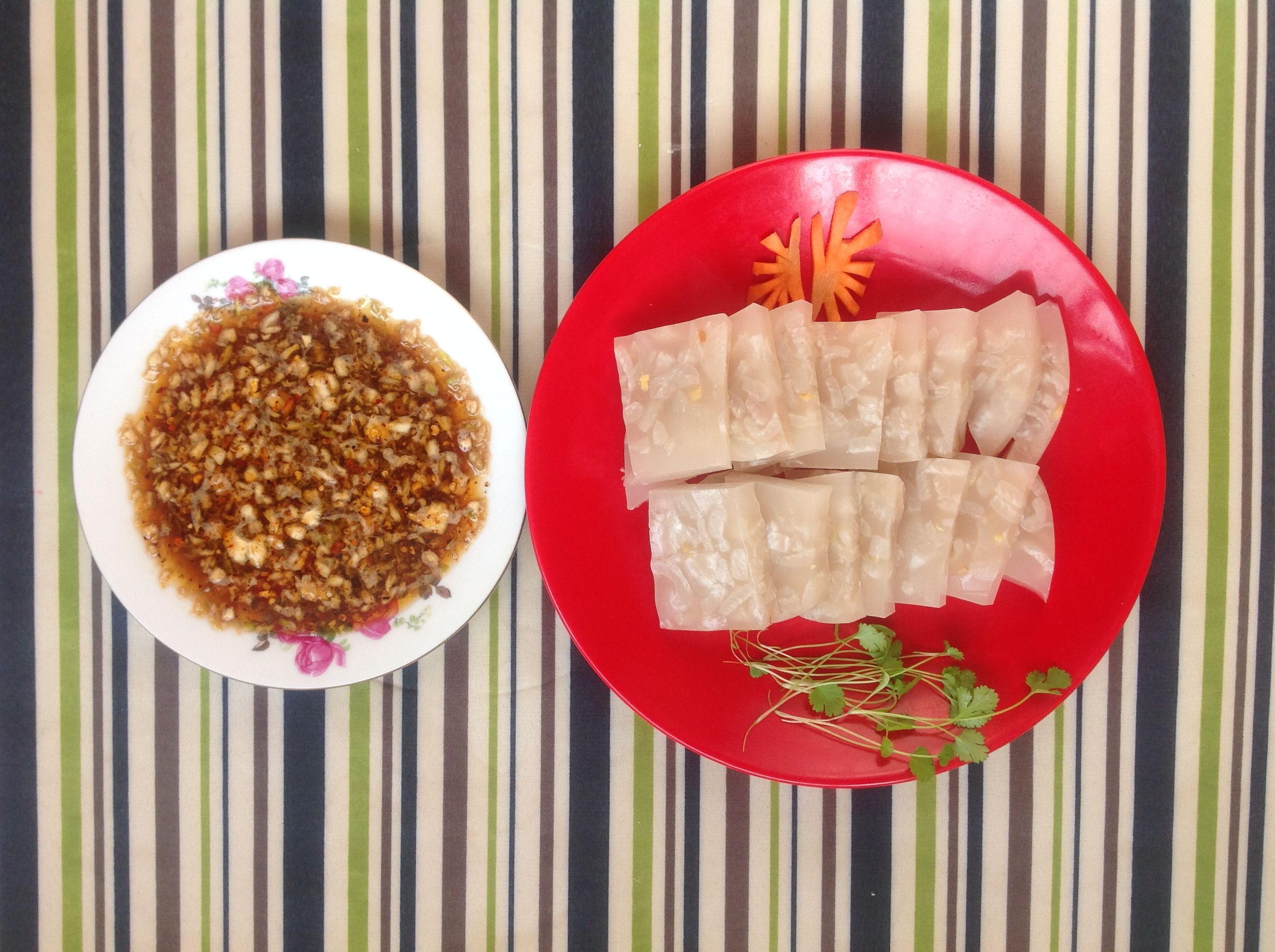 四、冷却好的皮冻切片装盘,调碟蒜泥沾料,沾上料汁,就可食用。