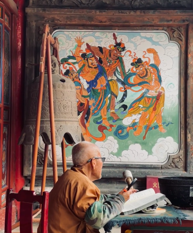 在抄录些什么,时不时敲一下面前的那只钵。