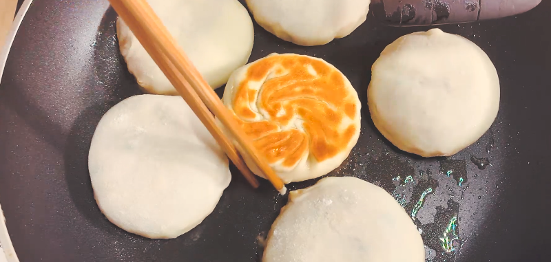 5、平底锅刷少许食用油,将馅饼铺在锅中,小火煎至两面金黄即可。这个过程大概8分钟左右。