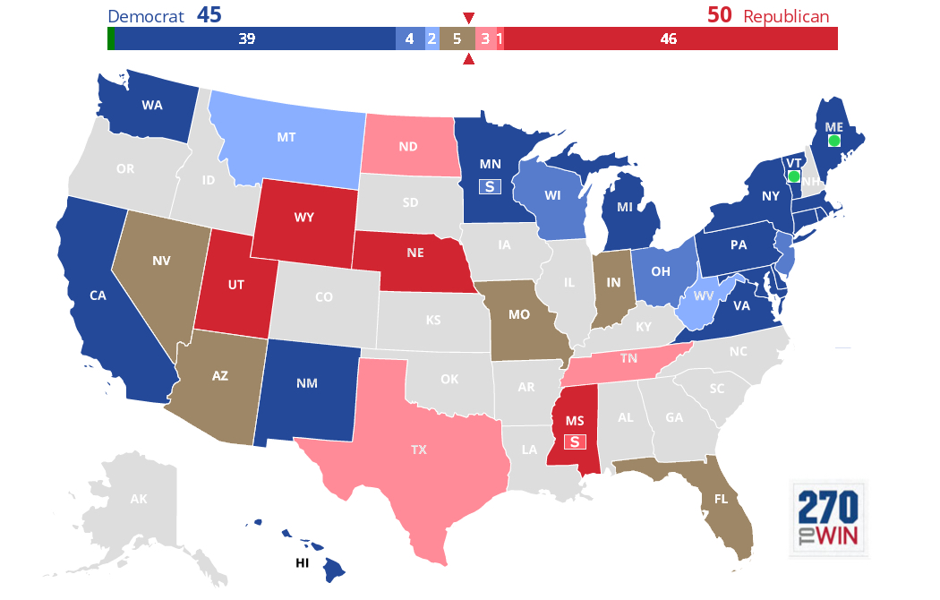 这届中期选举参议院的主要战场也就是10个州。这届的民主党的策略主要是推女性,来以亲民的姿态赢选票。下图是分析,棕色的5个州 民主党和共和党的民调持平,粉色是偏共和,浅蓝是偏民主。不过川普也算是提前布局了一下,去了摇摆的州一如既往的拉票 佛罗里达,田纳西,印第安纳,密苏里,还有北达。参议院的归属应该是republic的,51-54这个区间,大多数媒体也都是预测在这个区间内。