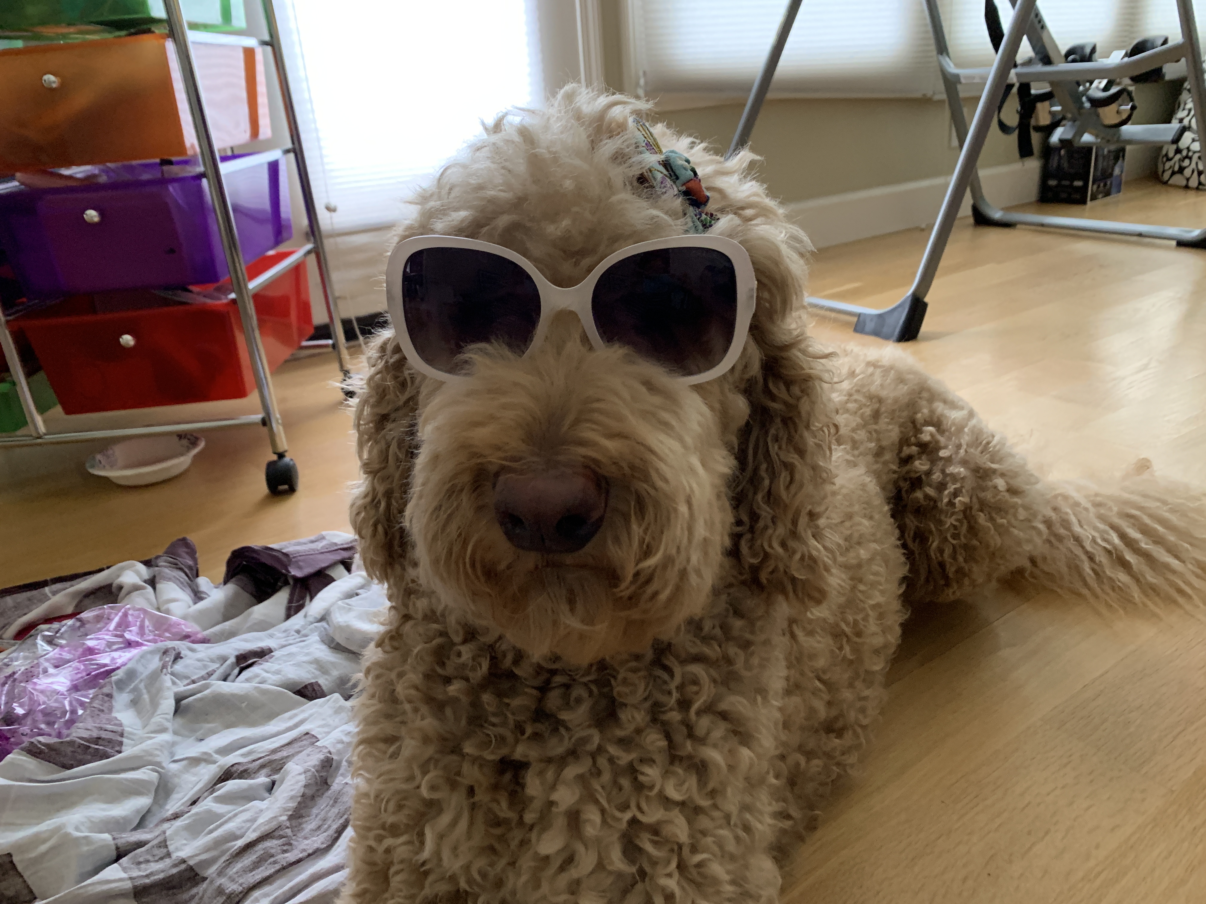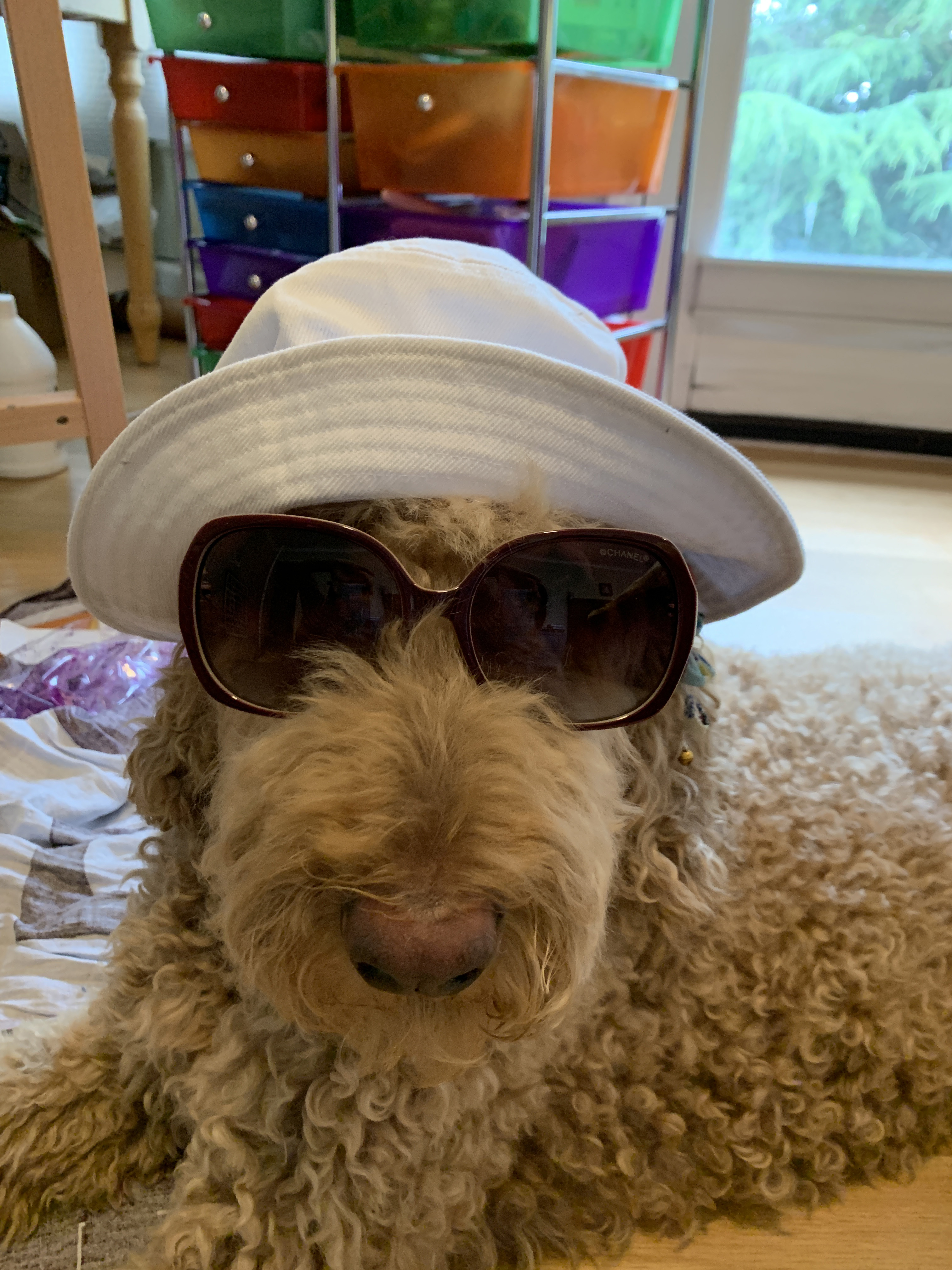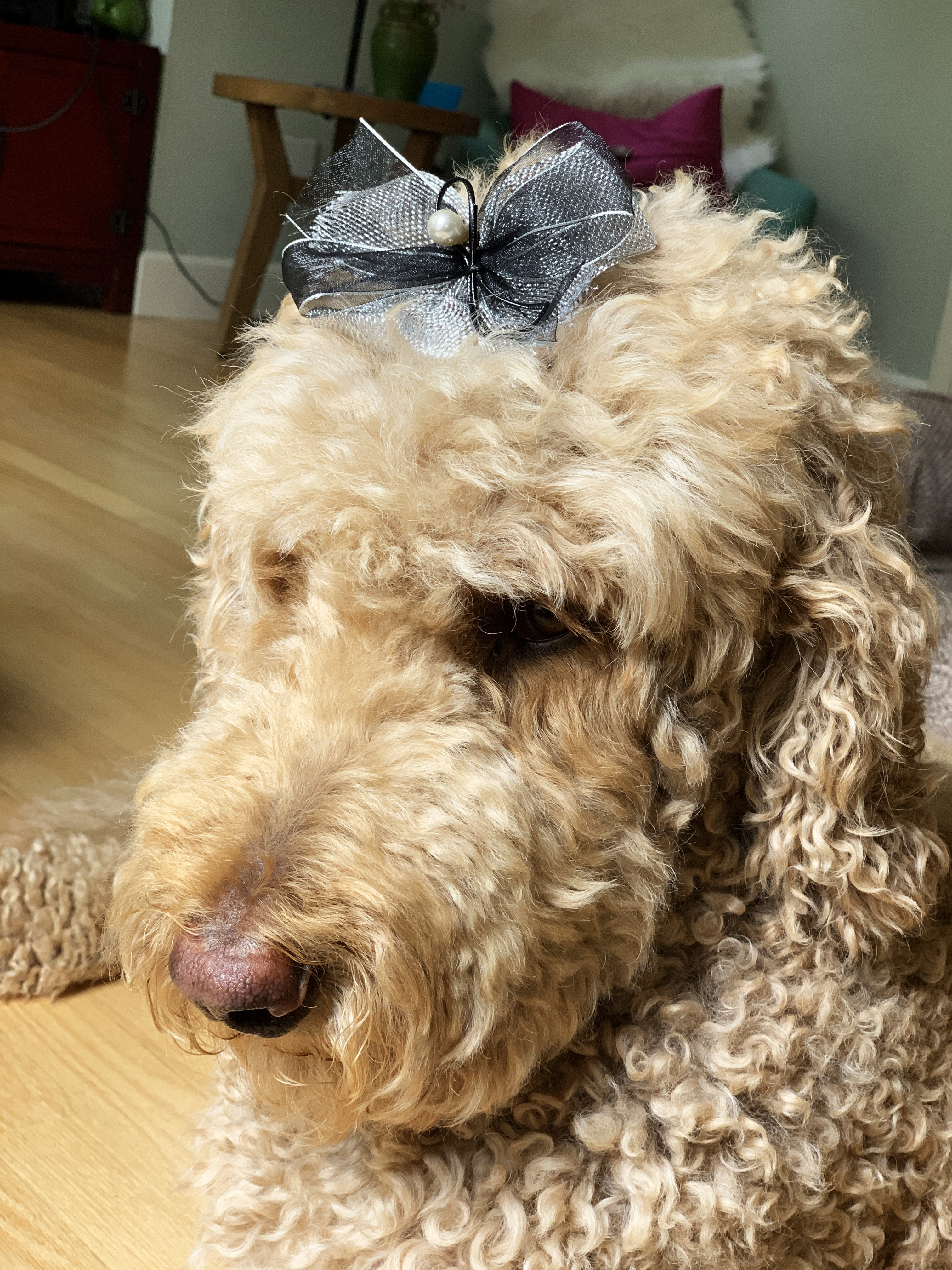 话说这公主是个混血,狗界俗称“串”,3/4血统来自poodle国内叫巨贵,1/4血统来自Lab国内叫拉普拉多。跟half/half的串不同,咱这公主更接近poodle,所以腿跟脸都要长那么一丢丢,性格上也接近巨贵,绝对高冷范。