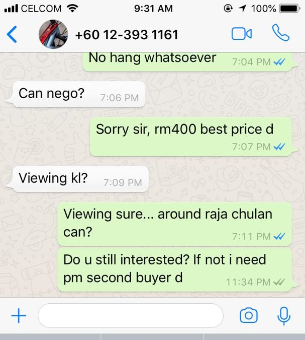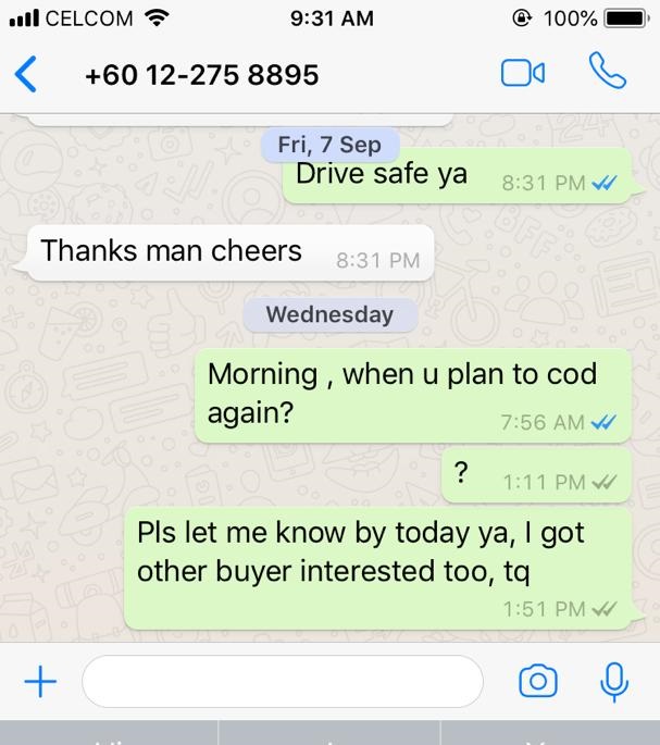 然后要我把物品押到两个星期才卖给他, 所以好吧, 看他那么有诚意,既然可以驾车来吉隆坡买, 就让给他吧。
