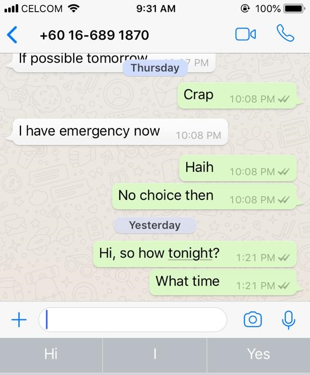 尼玛,这个真的是飞机王呀。。。害我敢死干命,竟然一句话 “I got emergency now"
