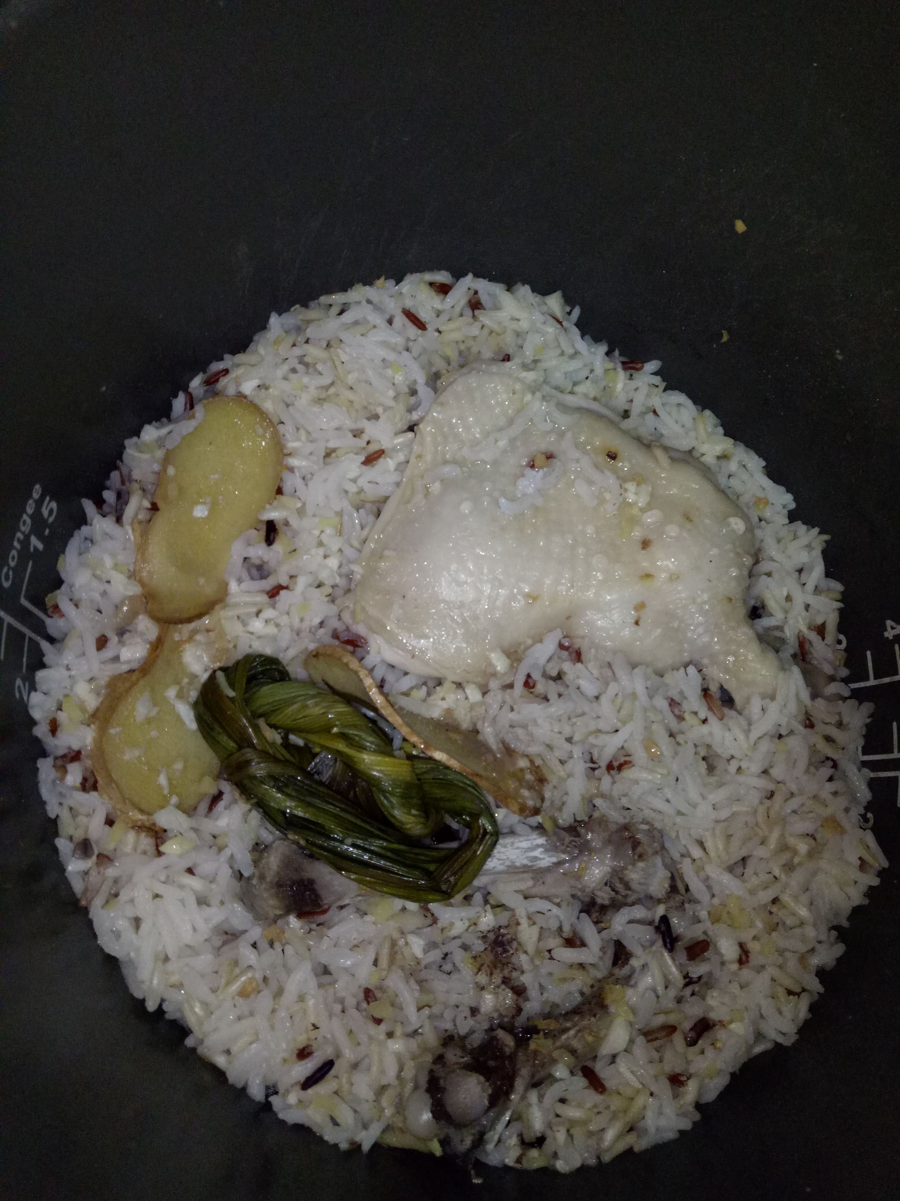 ❈再把雞腿,3片老姜與斑斕葉放在白米表面,點按鍵Cook步驟完成。