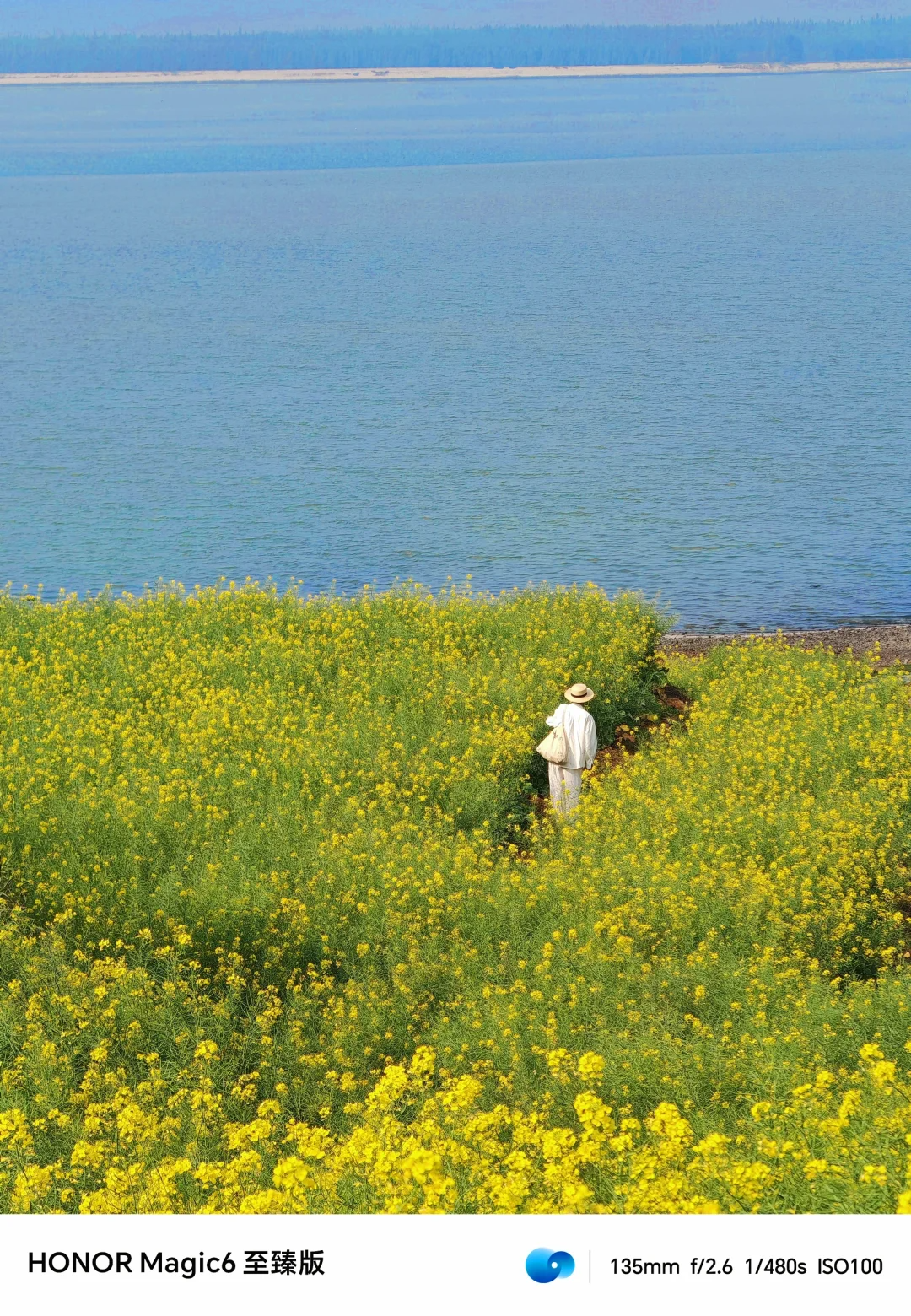 ❶油菜花当前景构图,用手机5倍拍人物走在花田中。