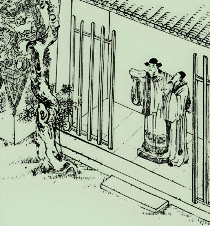 这时,官衙内传出一阵如雷鸣般的鼓声,震得侯翁耳膜生疼。绿衣人神色一凛,说道:“升堂了!”说罢,便拉着侯翁一同走进官衙。侯翁被带到台阶下,绿衣人安抚道:“你先在这等会儿,我去替你问问是怎么回事。”只见绿衣人走上前去,向一个身着官服、模样像官吏的人招手示意。那人从大堂上快步走下来,与绿衣人简单交谈了几句。交谈间,官吏模样的人不时向侯翁这边看来。片刻后,他径直走到侯翁面前,拱手施礼道:“侯大哥来了!你也没什么大事,只是有一匹马告了你,等会儿你们两下里一对质就可以回去了。”说完,便转身回到大堂之上。