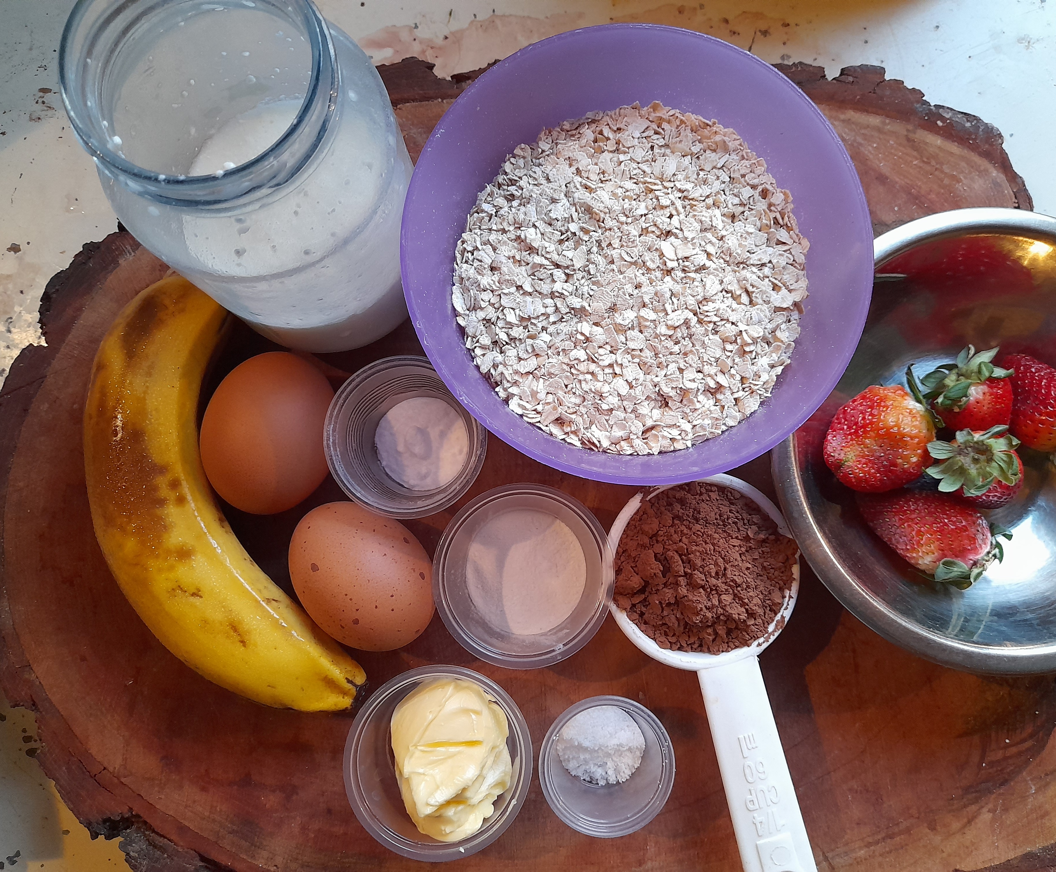 First we peel and cut the banana, then we add it to the blender as well as the rest of the ingredients; such as margarine, eggs, cocoa powder, oatmeal, baking soda, baking powder, salt, and fluid milk.