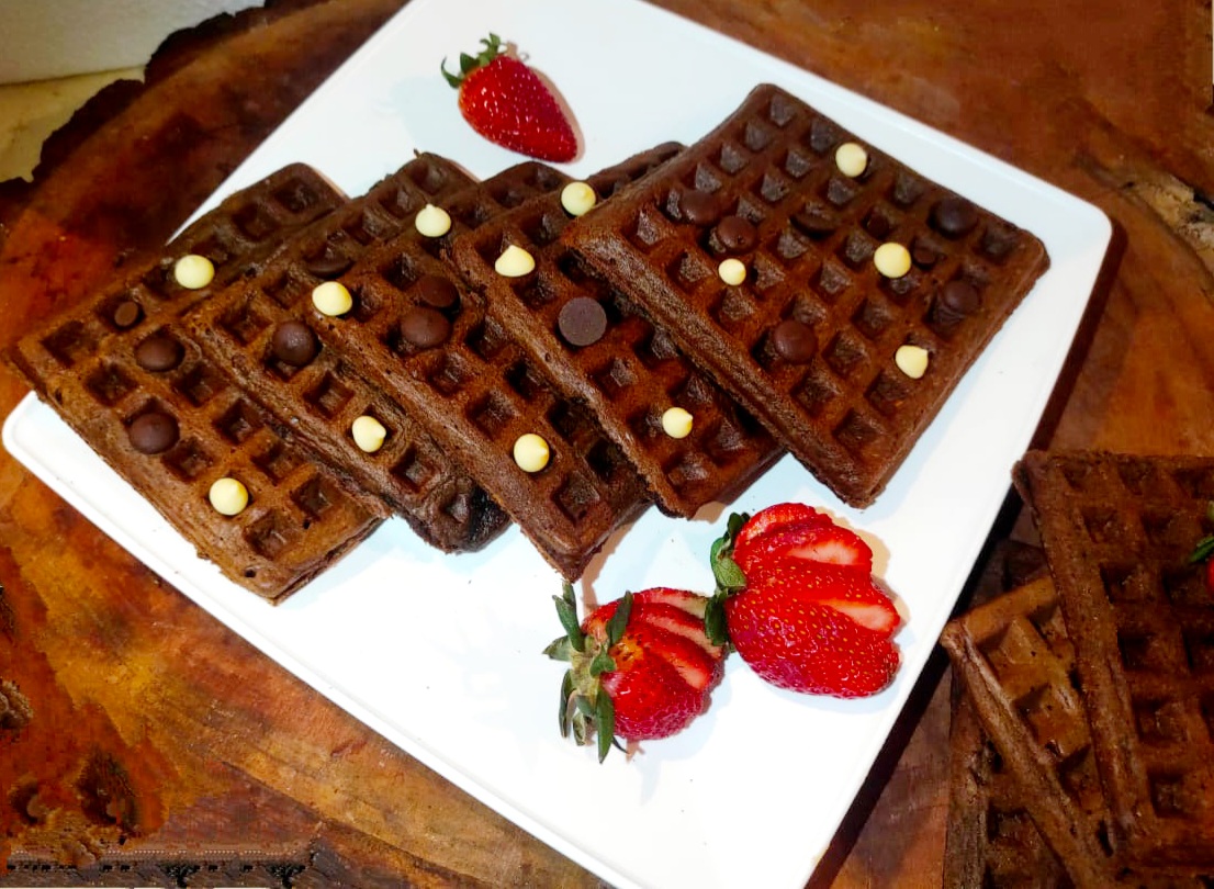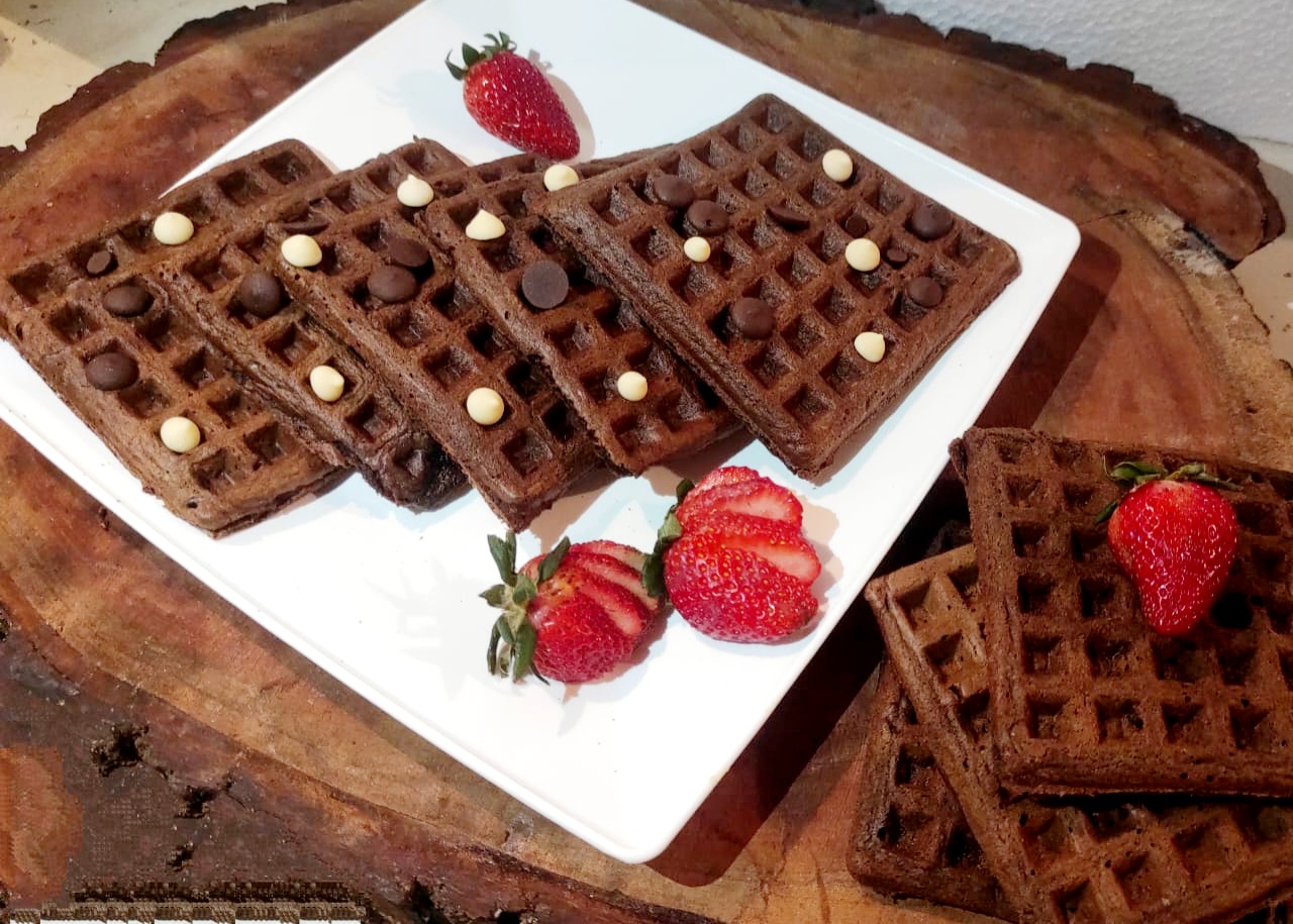 Servimos aun tibias, acompañadas de gotas de chocolate oscuro y blanco. Además de una deliciosas fresas frescas. Y ya podemos disfrutar de estos deliciosow Waffles de Avena, Cambur y Cacao.