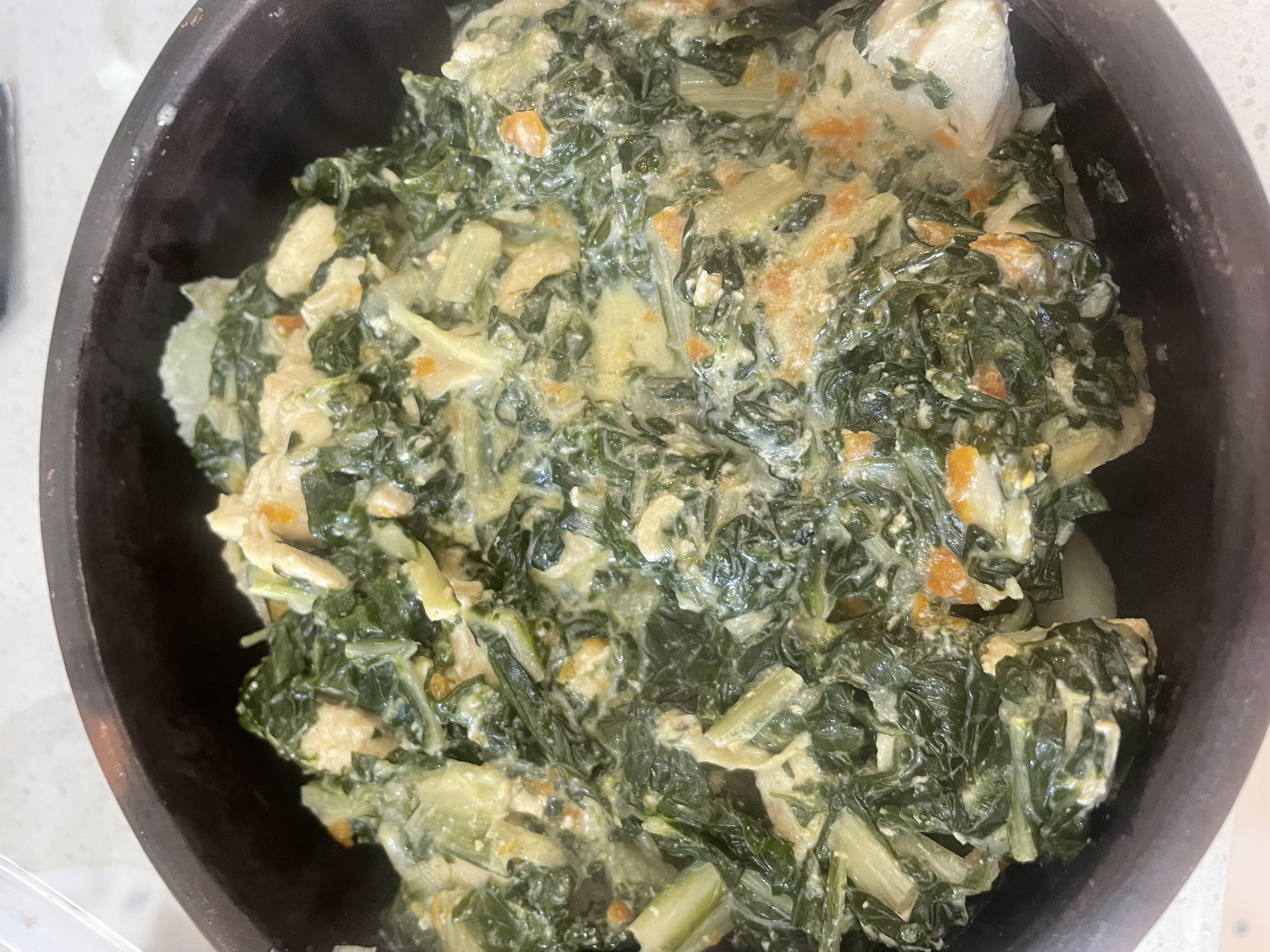 Luego se incorpora el pollo picado en cubitos (o la carne que hayas decidido usar) y se deja cocinar, revolviendo de vez en cuando. Cuando el pollo esté casi listo, se agrega la acelga picada y se sazona al gusto. Es importante ir revolviendo para que las verduras y la carne no se peguen al fondo de la olla. Cuando la acelga haya reducido su tamaño, se agrega la crema. Luego de verificar el sabor, se retira del fuego.
