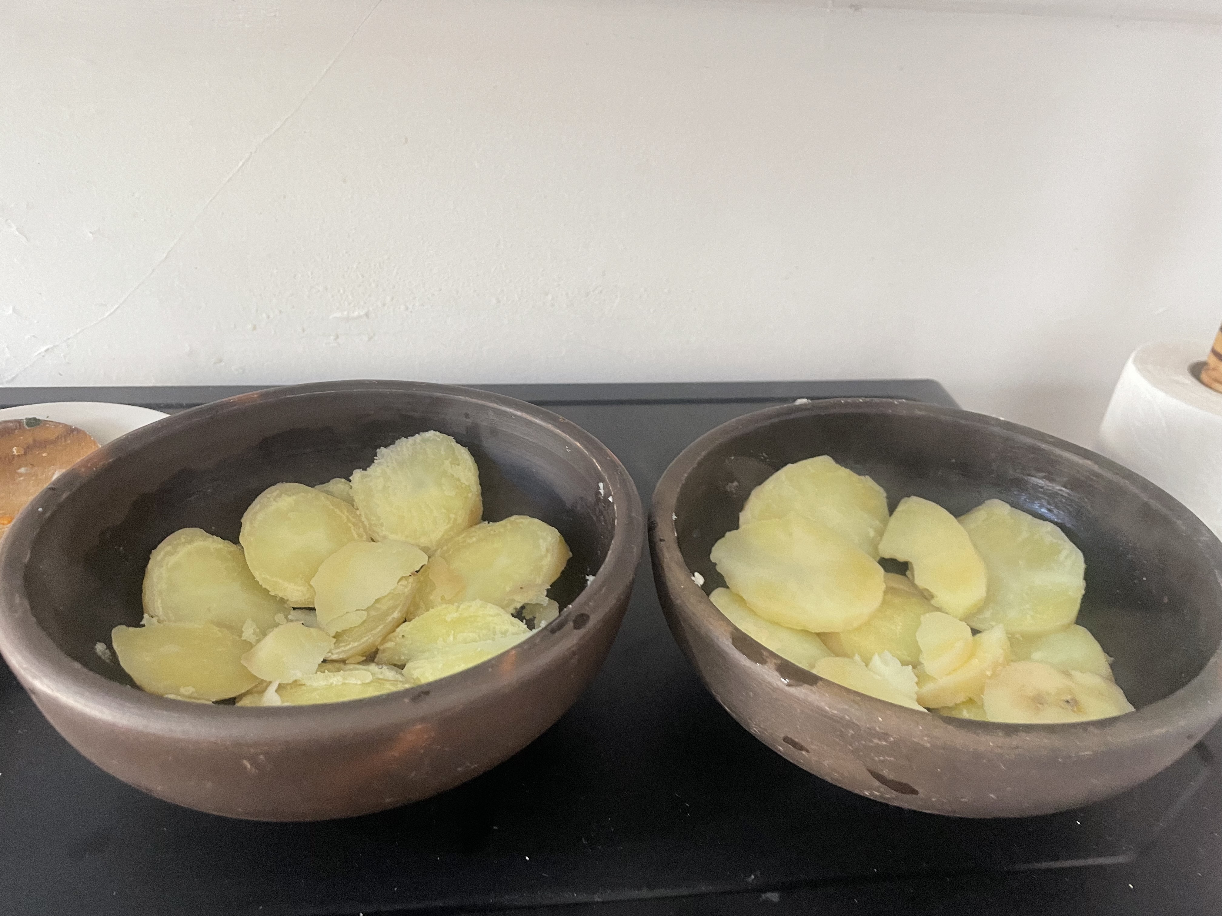 Por otro lado, una vez cocidas las papas, se pelan y se cortan en rodajas. Luego se disponen en una fuente para horno, como si fuera la base de un quiche o tarta (puede ser en fuentes individuales, así lo preparo yo). Encima se pone la mezcla recién preparada y, finalmente, se espolvorea el queso y se lleva al horno a gratinar.