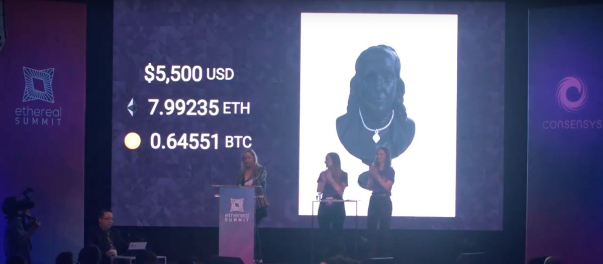 Оплата лота осуществляется криптовалютой эфириумом или биткоином, в пример отчет с конценсуса 2018: