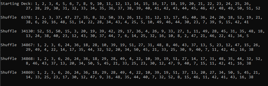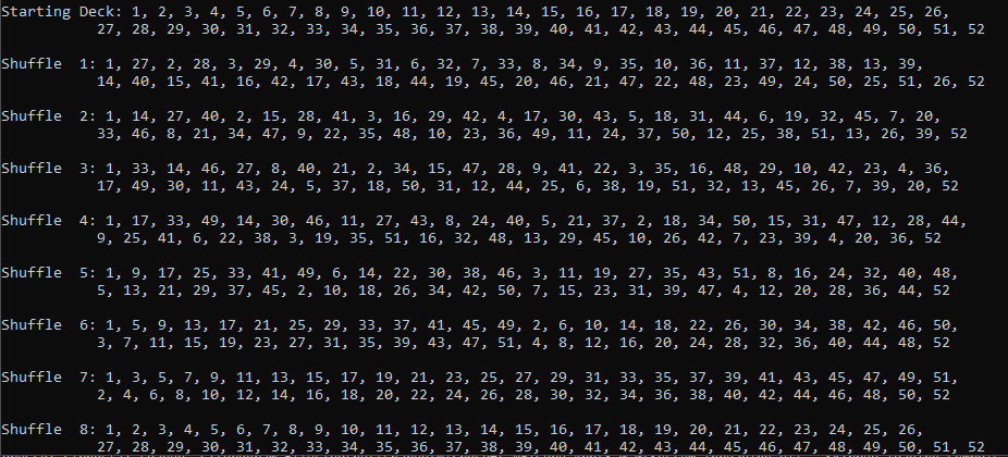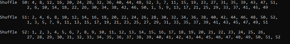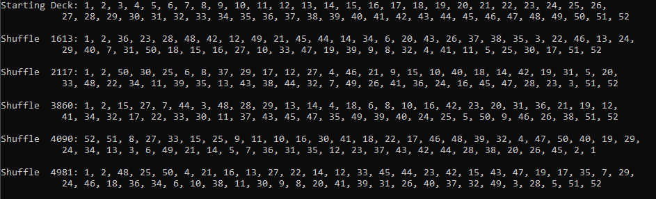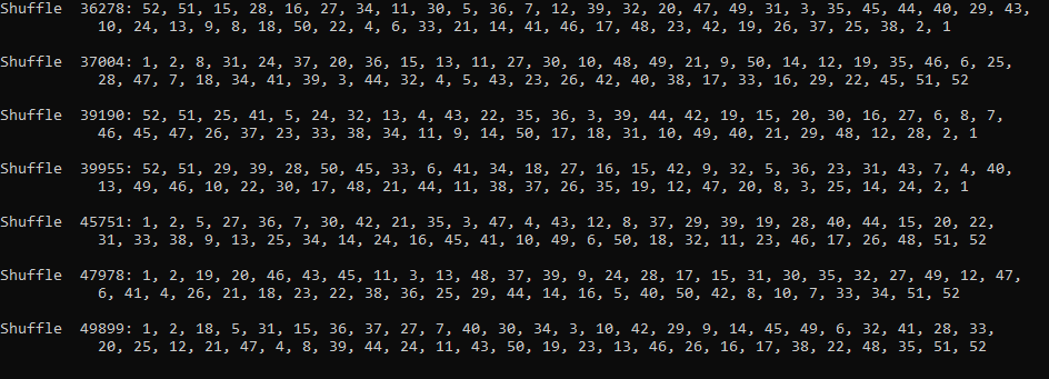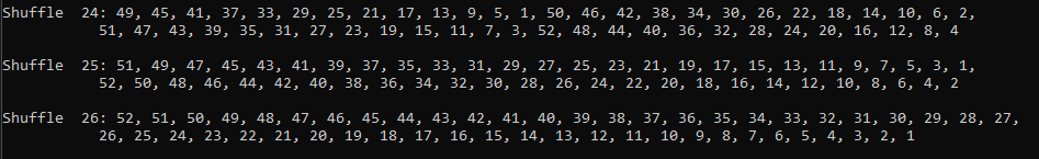 But let's see if we can't find out how many shuffles it will take to get back in order (I'll include backwards order too). To make the output less cumbersome, I only wrote to console if the first 2 cards AND the last two cards were in order.